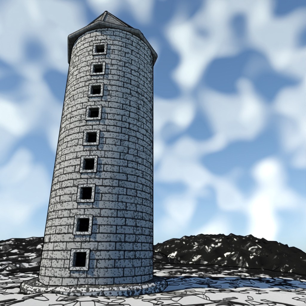 Storage of silage by agricultural silo used to be very common practice on many of the farms in my local area of rural Colorado (as well as many other parts of the world). As such, these monolithic towers are dotted all over the landscape and one of my childhood friends even had one on his property. I basically made this model from memory of what I’ve seen around the area. I used CPU Arnold to render so I could use the Toon Shader. I make my clouds by using a massive white sphere with its transparency controlled by a noise map.