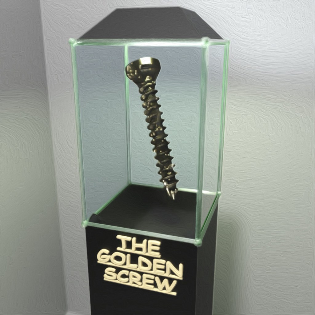 I was in some kind of mood so I downloaded a 3D model of a stainless steel flat head screw from the McMaster-Carr catalog website and put it into a case like it belongs in a museum. The screw has a polished gold material that I added an emission noise map to in order to make it have the sparkling look.