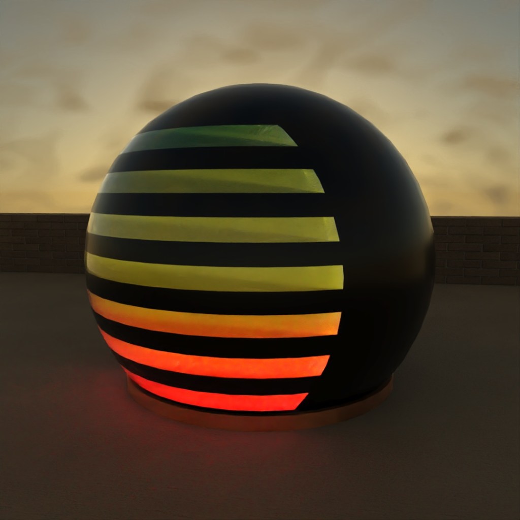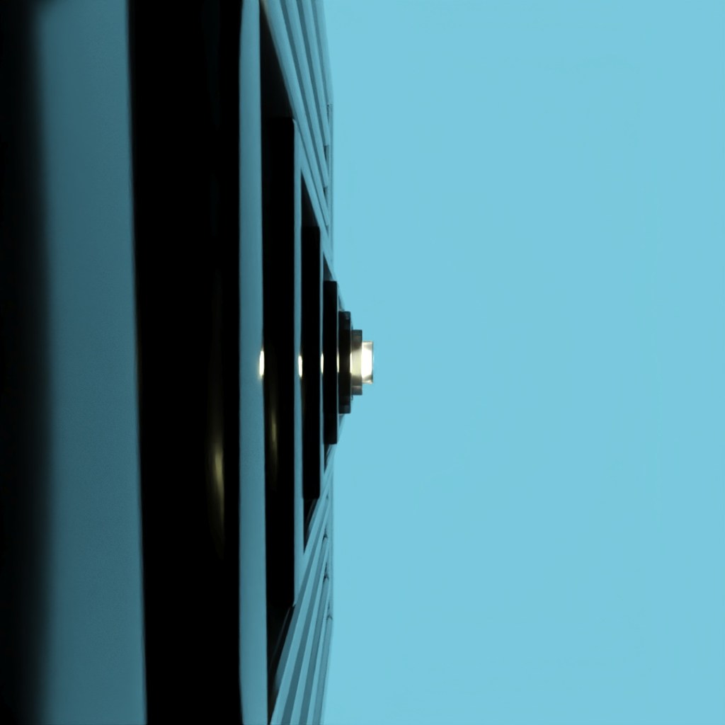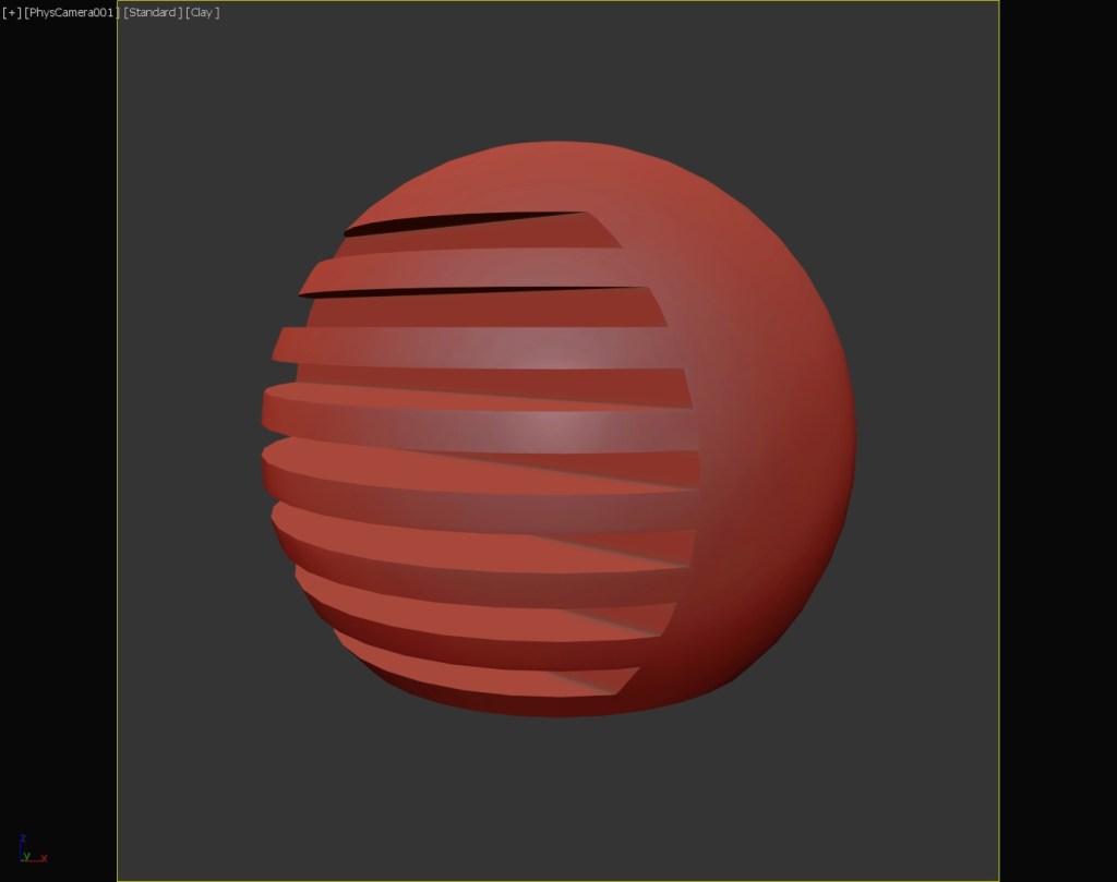 Another exercise in using the gradient map. To model the shape, I placed several long boxes intersecting the side of the large sphere and used Boolean once to subtract the boxes from the sphere and a second time capturing the intersect of the boxes and the sphere. The sphere has a black glossy plastic material applied to it. For the charging indicator, I applied a color gradient map with three colors (red, yellow, green) to a frosted glass material and used UVW Map to orient the gradient vertically.