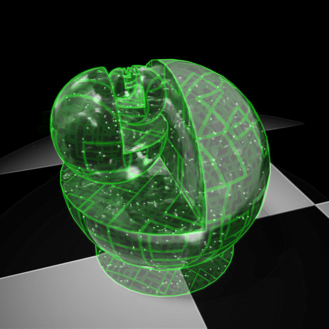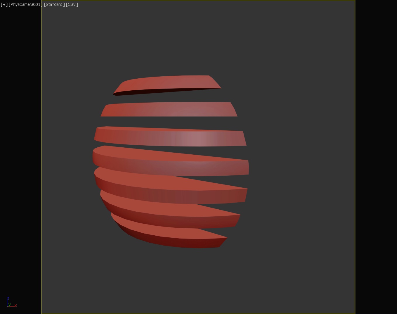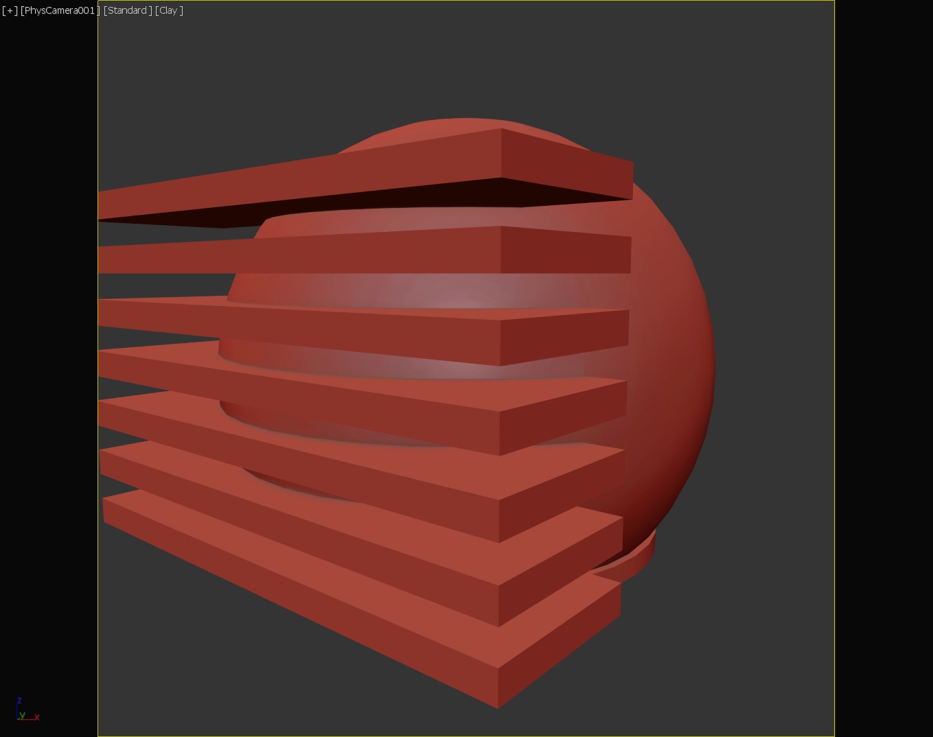 Another exercise in using the gradient map. To model the shape, I placed several long boxes intersecting the side of the large sphere and used Boolean once to subtract the boxes from the sphere and a second time capturing the intersect of the boxes and the sphere. The sphere has a black glossy plastic material applied to it. For the charging indicator, I applied a color gradient map with three colors (red, yellow, green) to a frosted glass material and used UVW Map to orient the gradient vertically.