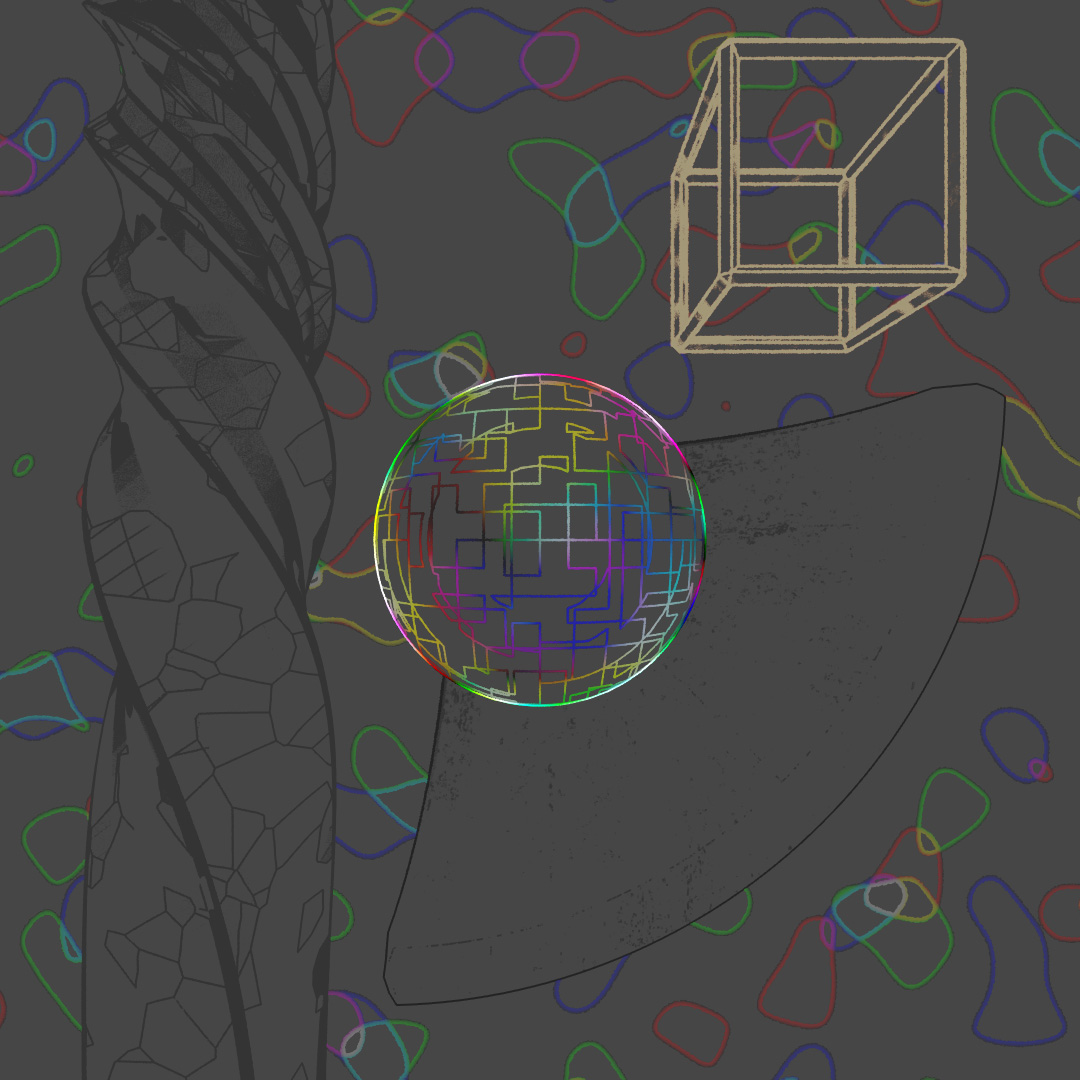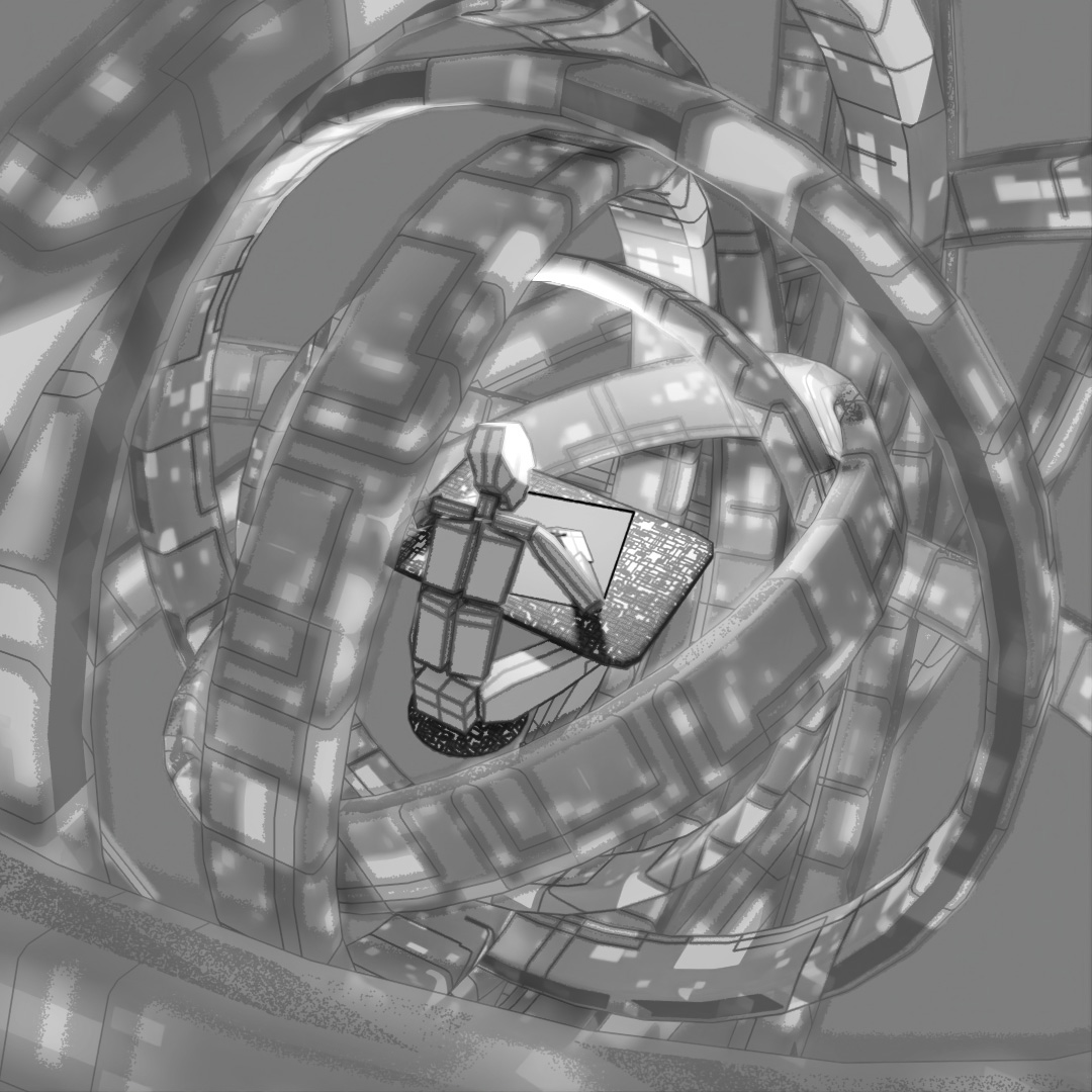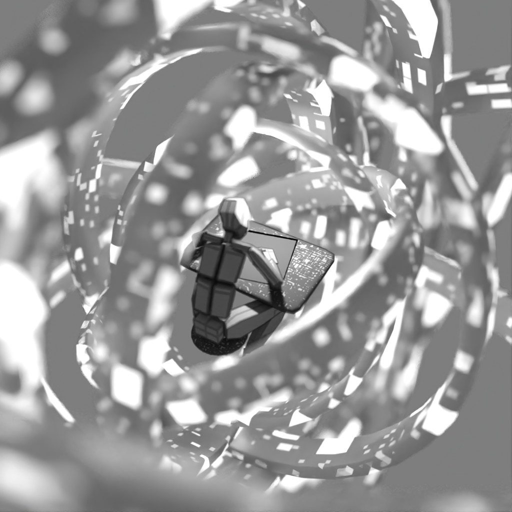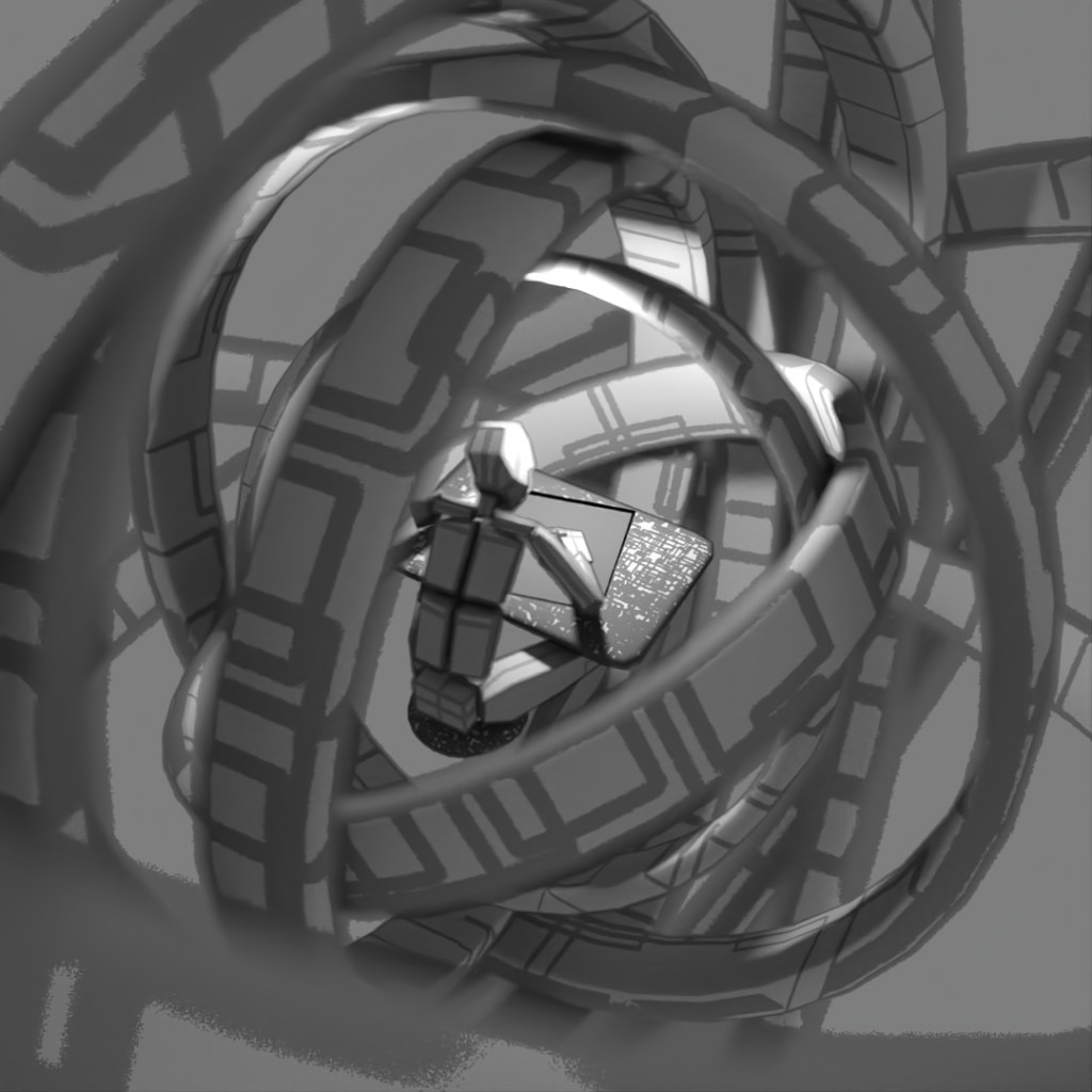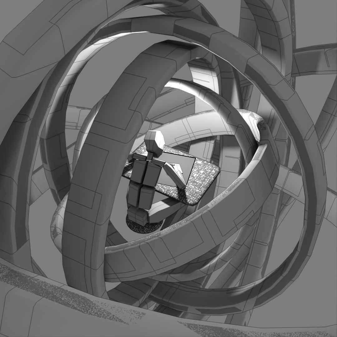 Wanted to make a looping animation where the biped character is sketching the sphere contraption around him. The rings spinning around him are the same ring scaled up in the X and Y directions and then rotated different directions around the axis. Rendered the last frame to use as the sketch in the beginning of the clip. For the still-frame version, I again started with a base image and made versions with Depth of Field on and different apertures and also applied a noise map emission to the rings.