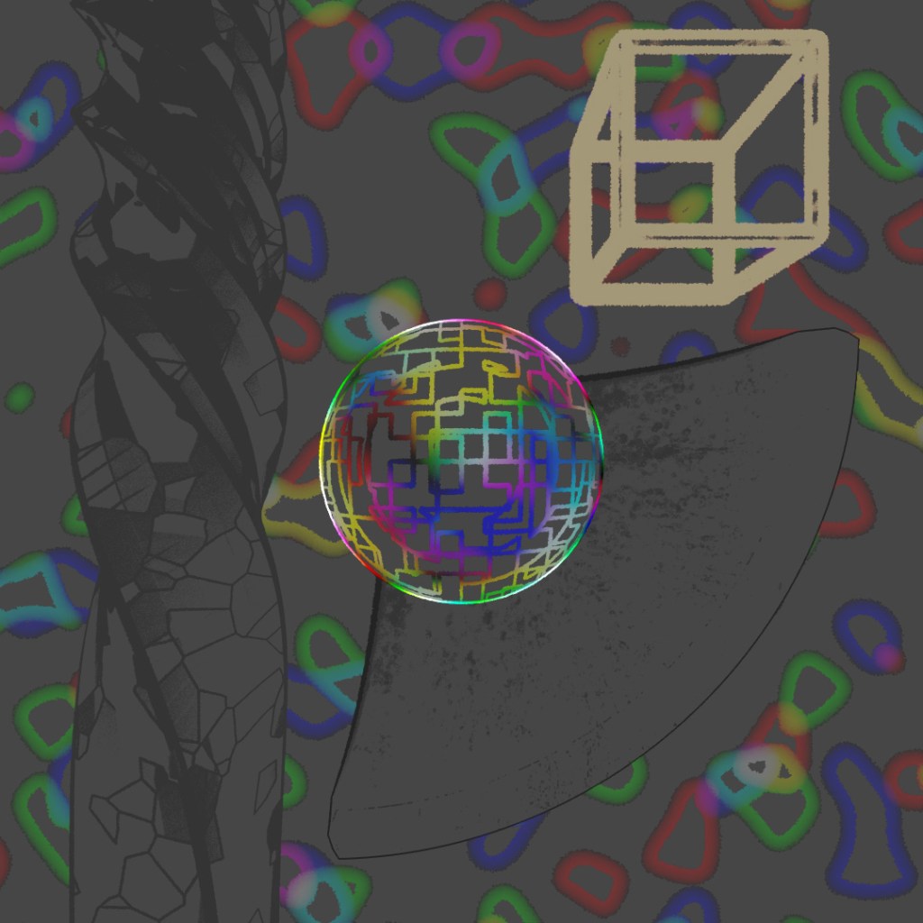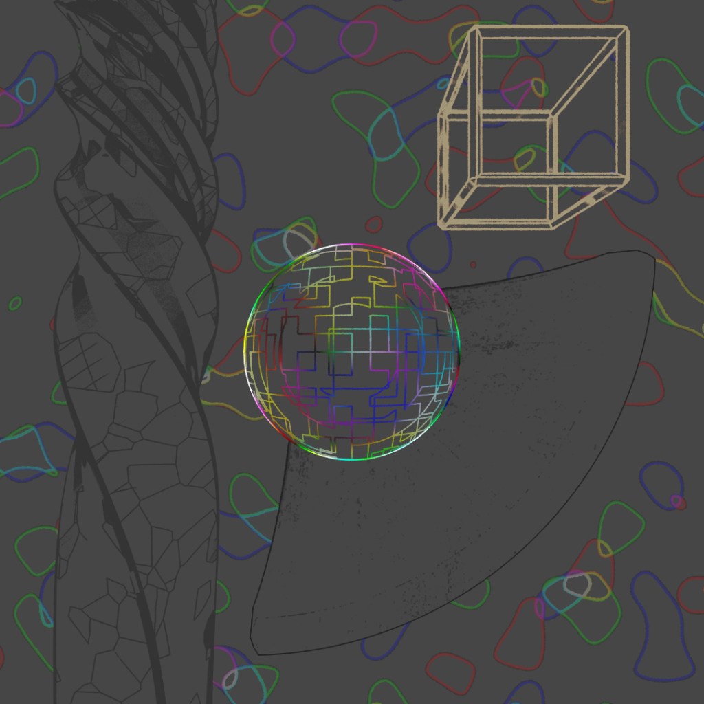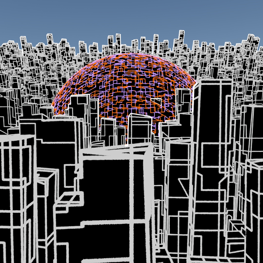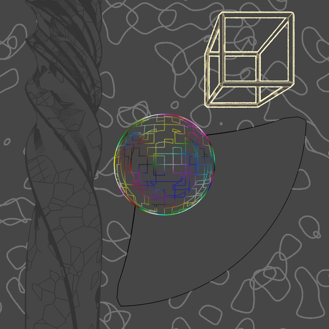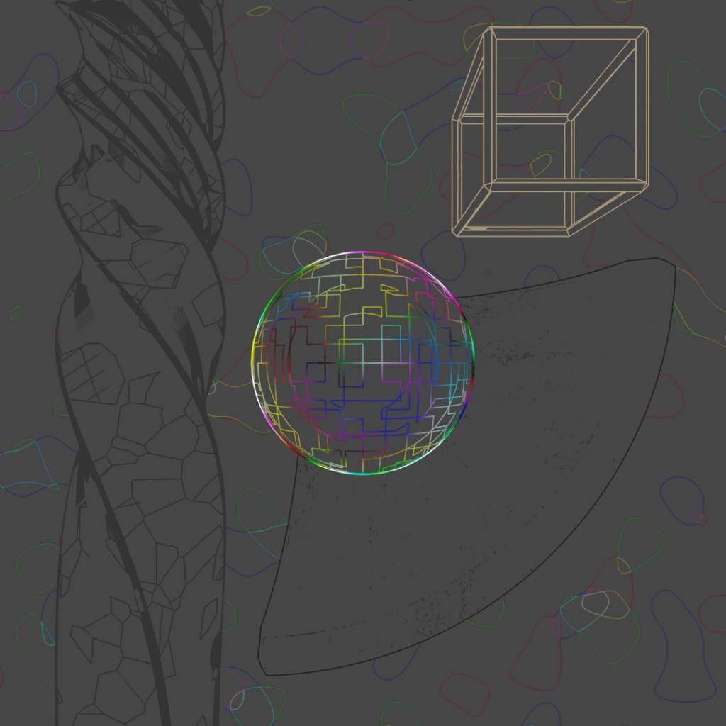Wanted to make a looping animation where the biped character is sketching the sphere contraption around him. The rings spinning around him are the same ring scaled up in the X and Y directions and then rotated different directions around the axis. Rendered the last frame to use as the sketch in the beginning of the clip. For the still-frame version, I again started with a base image and made versions with Depth of Field on and different apertures and also applied a noise map emission to the rings.