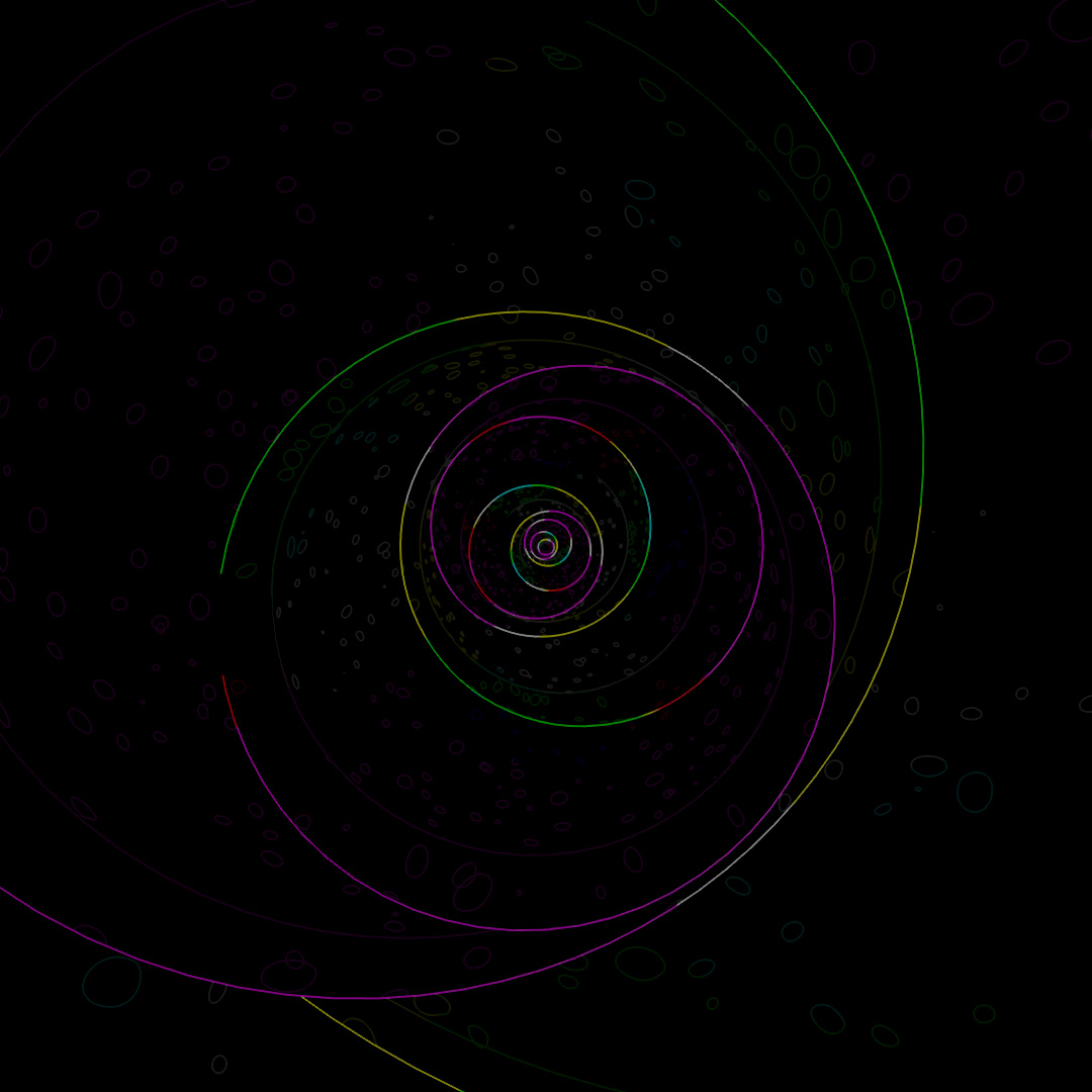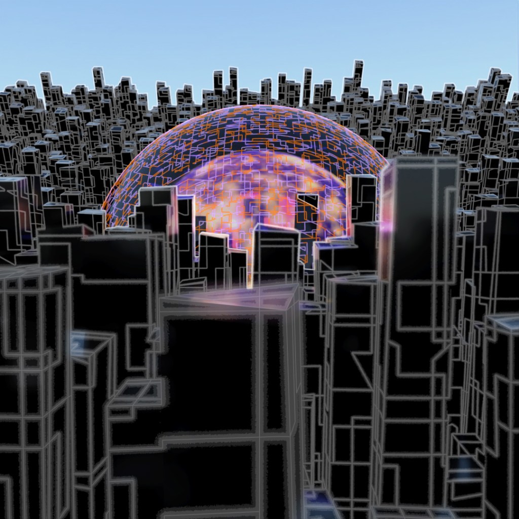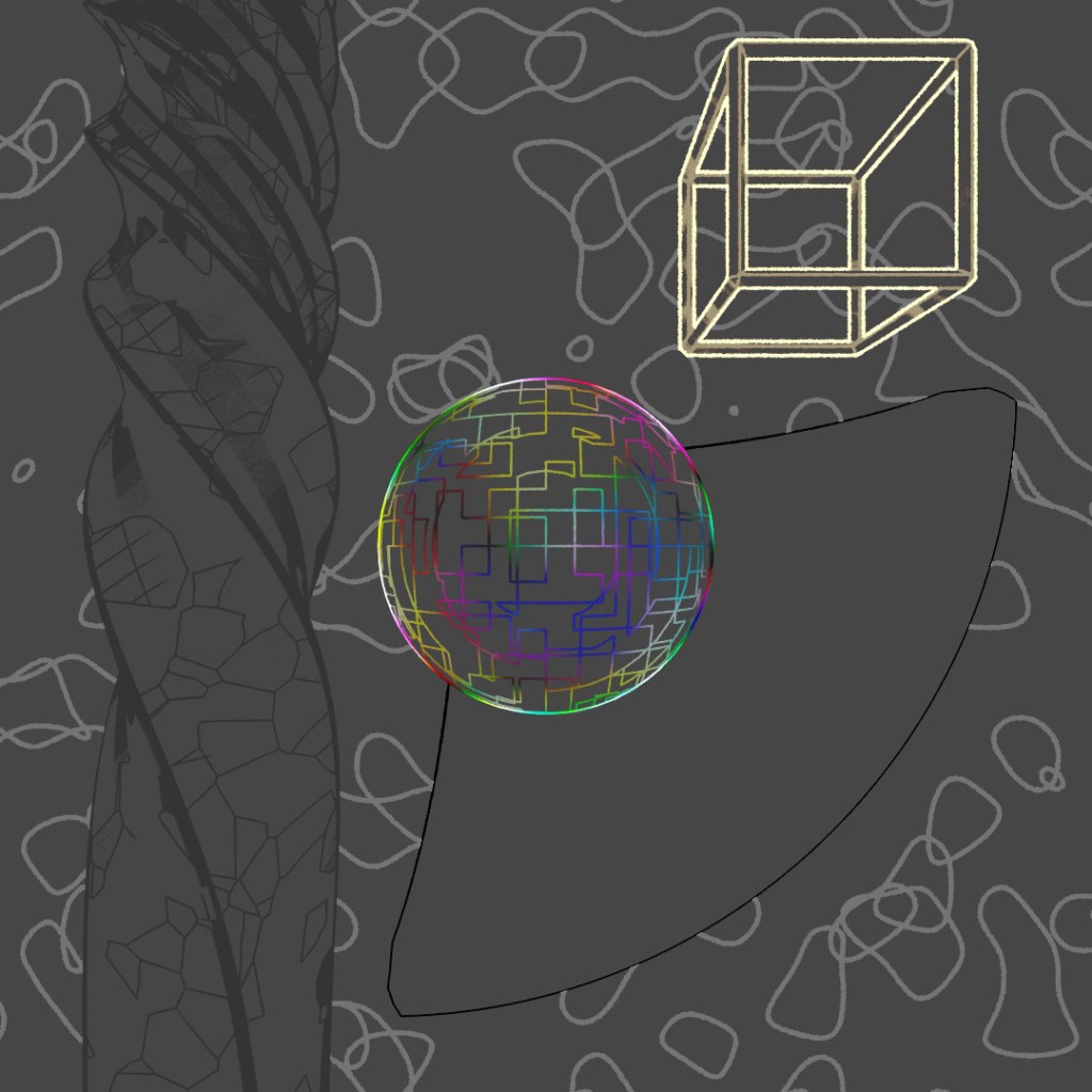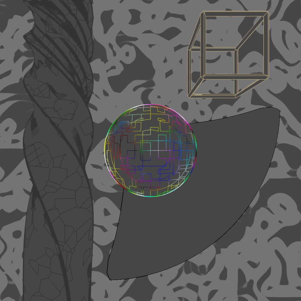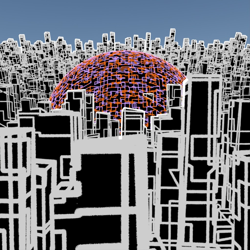 Wanted to make a looping animation where the biped character is sketching the sphere contraption around him. The rings spinning around him are the same ring scaled up in the X and Y directions and then rotated different directions around the axis. Rendered the last frame to use as the sketch in the beginning of the clip. For the still-frame version, I again started with a base image and made versions with Depth of Field on and different apertures and also applied a noise map emission to the rings.