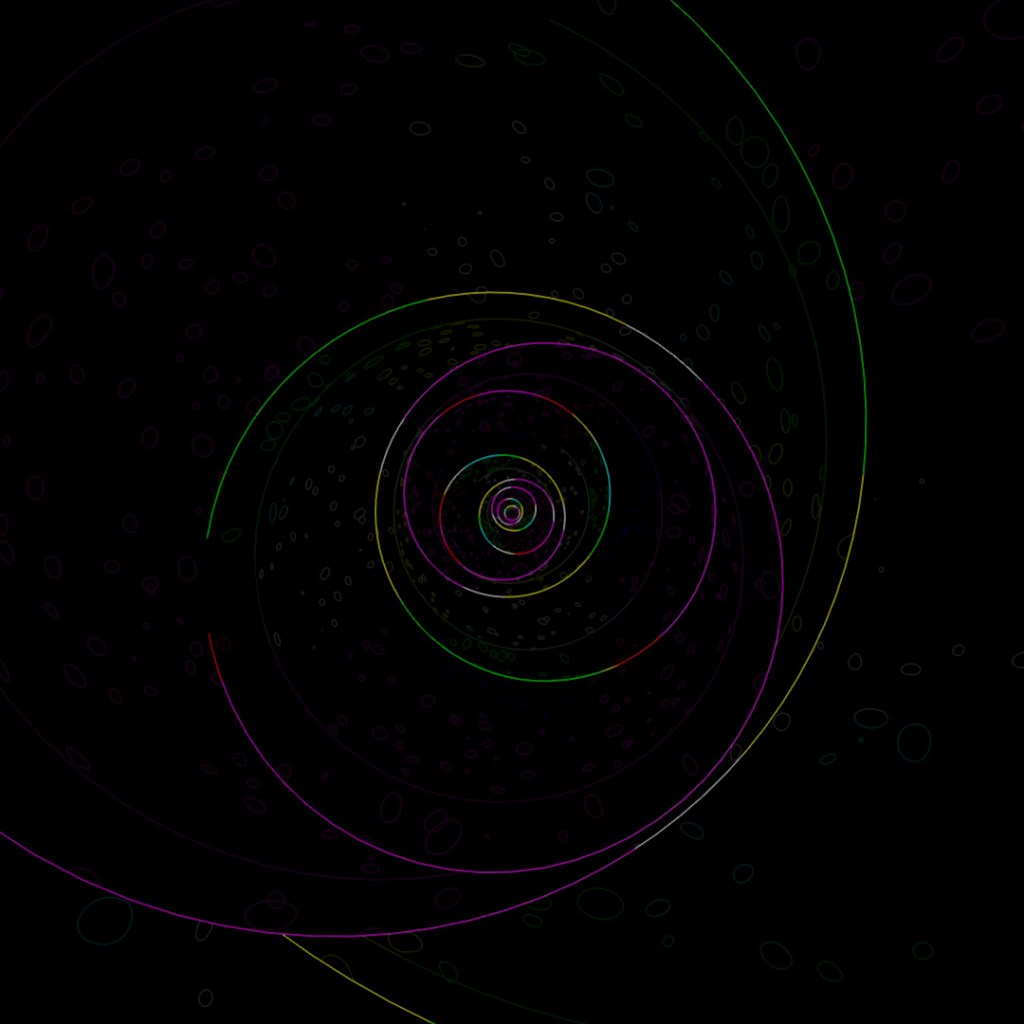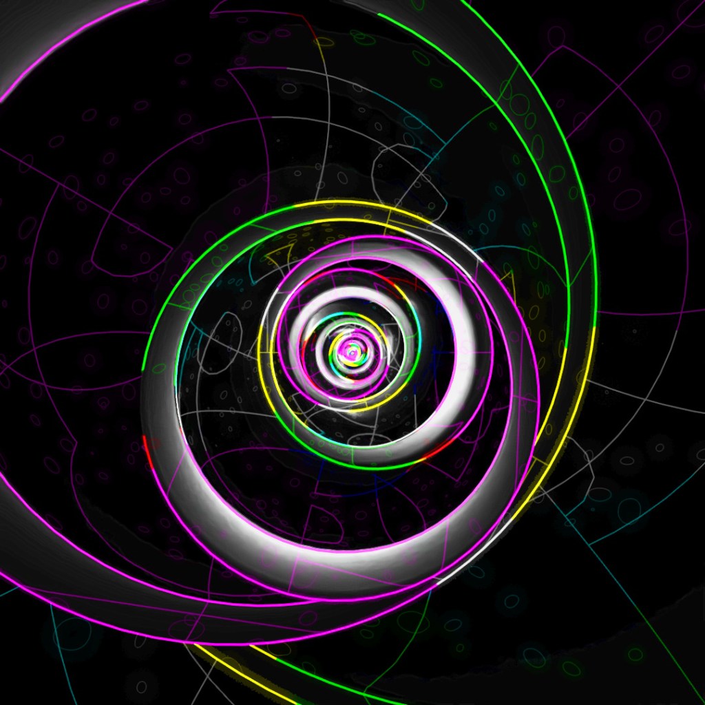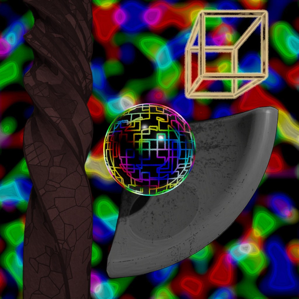 Similar to the previous post, I started off with a sphere and applied the shell, slice and chamfer modifiers. Then I tilted the sphere slightly off-center and used array to scale the sphere up and rotate each copy around the axis. Started with a base of glossy black plastic and again used Toon Shader to layer on the glowing lines.
