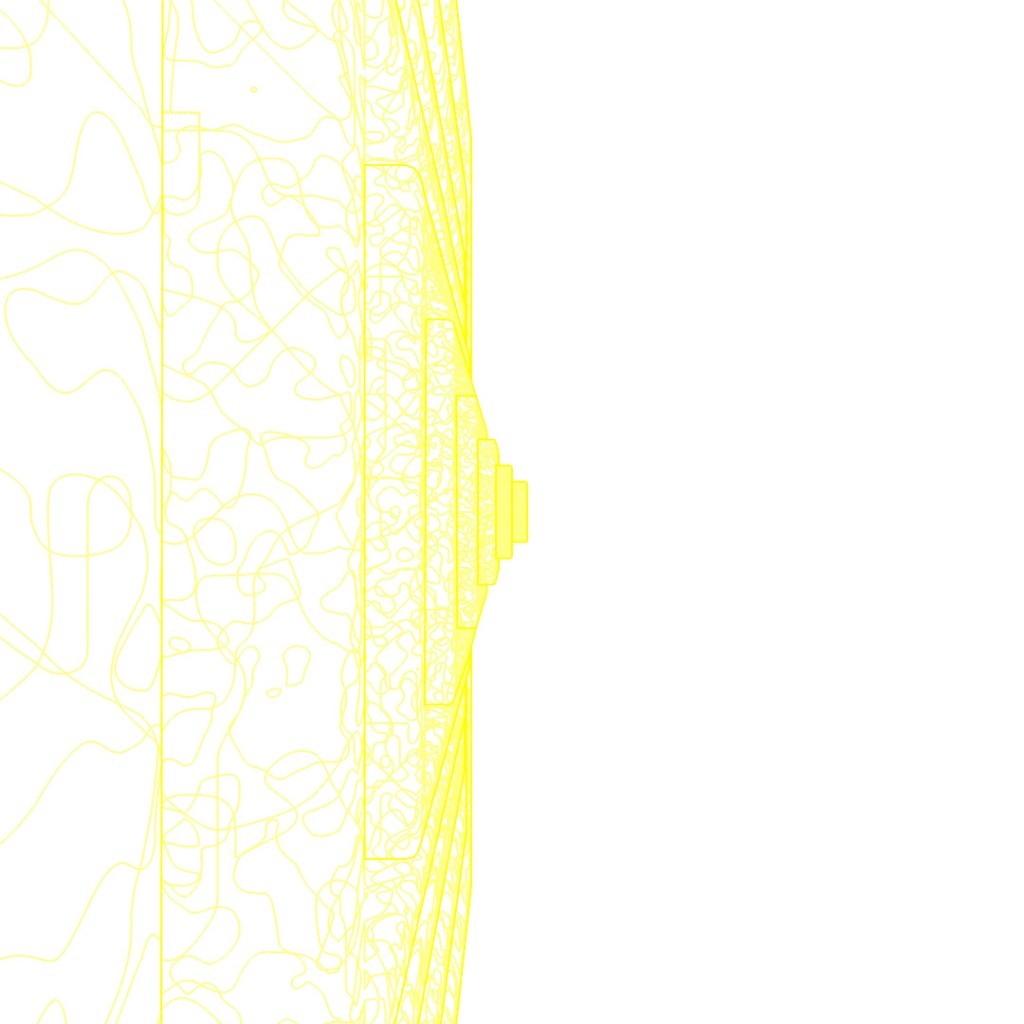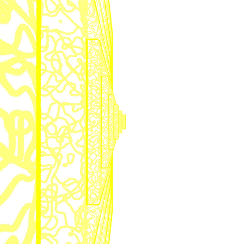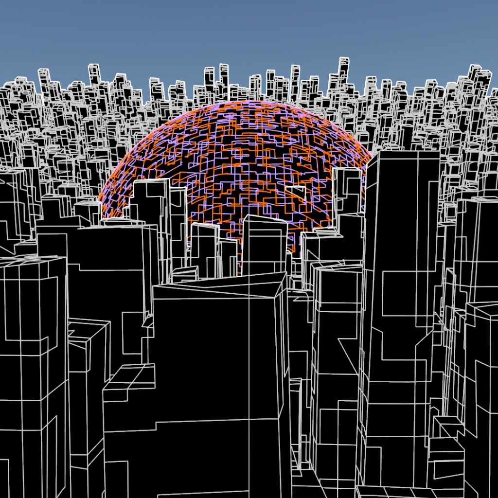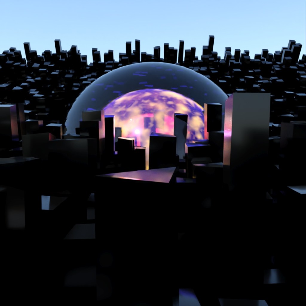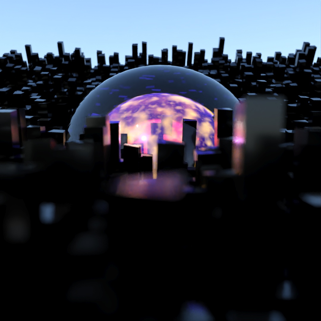 Started off with a tall skinny black glossy plastic box and used Scatter to distribute copies across the surface of a curved plane. Used the parameters to randomly vary the z-position, add up to a 2° rotation and 5% chaos to the vertices of the copies. In the middle I added a large transparent sphere, a medium sized transparent sphere with a noise map of orange emission and then a small sphere of emissive yellow. Then rendered different versions with Depth of Field on and varying apertures and also Toon Shader versions and layered them all together.