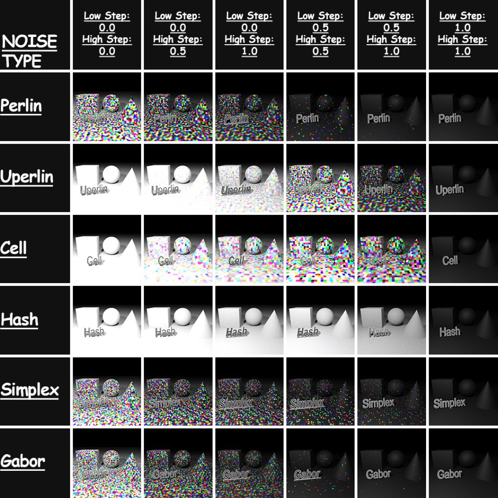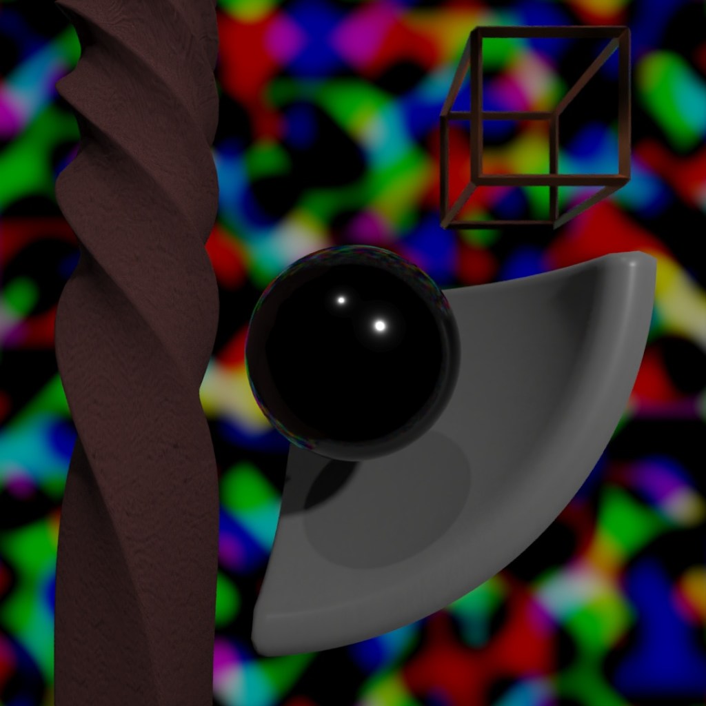 With a plane, box, sphere and cone, I applied a 3D Noise map to a matte paint material and changed 3 different parameters (noise type, low step and high step) to create this chart. I had no idea at the beginning of this project that the final result would have such a cool gradient look to it.