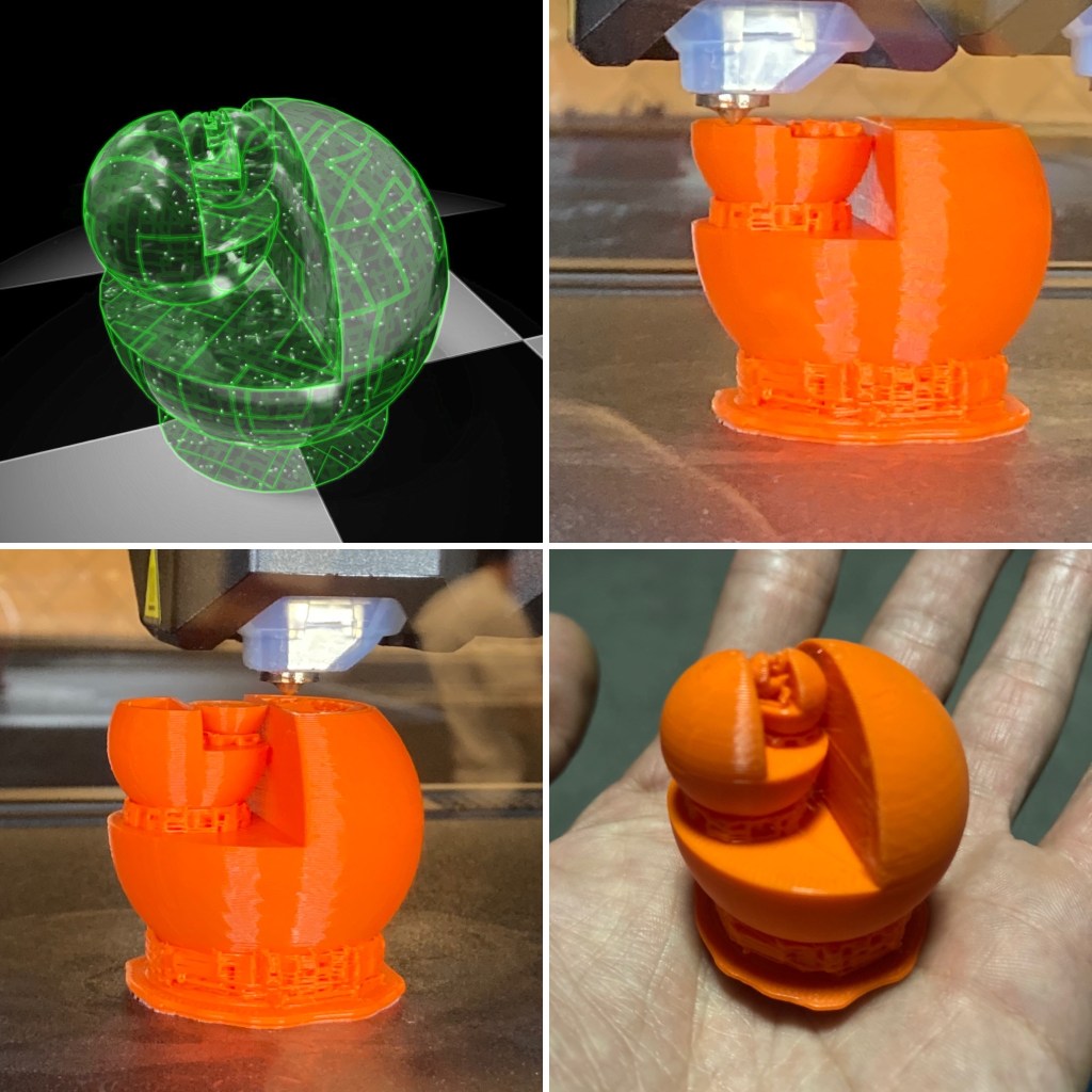 Retried the sphere fractal idea except I didn’t use the hemisphere option this time. Boolean union’d them all together to make one single shape. In class, I got to use a MakerBot Method X to print it out. Probably a massive under-utilization for such an amazing printer, but its my first week actually printing and I randomly got assigned the nicest printer! Cool thing about the fractal nature is it shows how detailed the 3D Printer can get.
