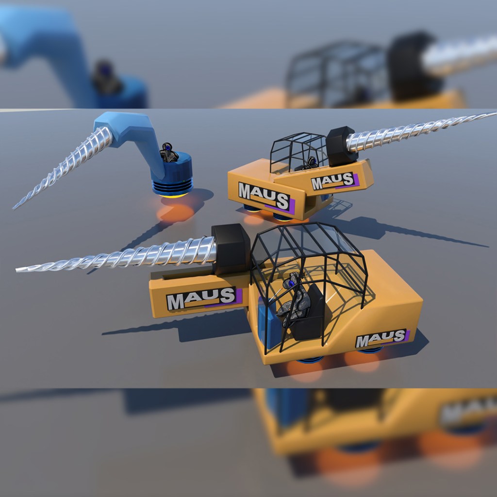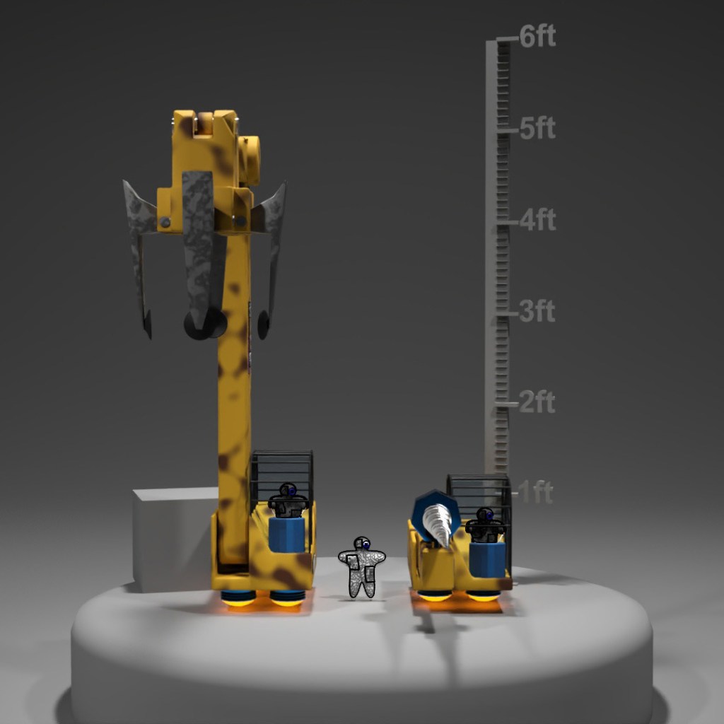 I had finished modeling the NRG crystal extractors and drillers and wanted to give a rough idea of how the Tiny Dolls extract the crystals from their cases, carry them to the deposit funnel and hold them in place while the driller machine drills into the crystals. The extractor then deposits the empty crystal back into the transport case.