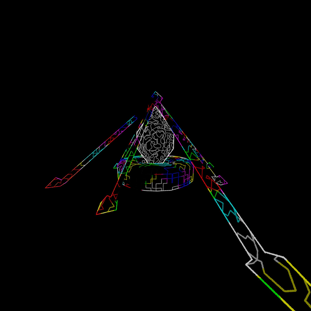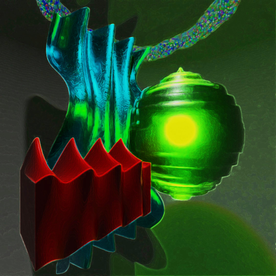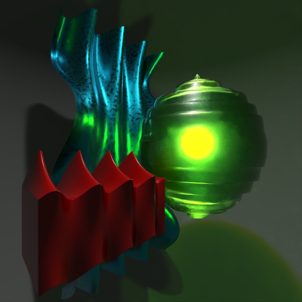 For this post, I was wanting to make something geometric and abstract but colorful. I rendered six different versions of this scene, some using Toon Shader, and layered them all together at different opacities to get this appearance. I rendered one version with only the center torus knot active because using the ToonShader, the crystal is not transparent but I still wanted a Toon Shader version of the torus knot in the final image.