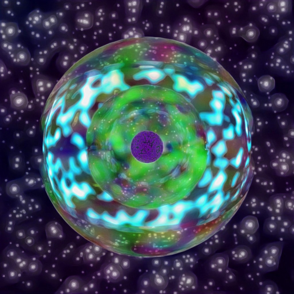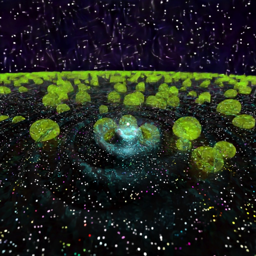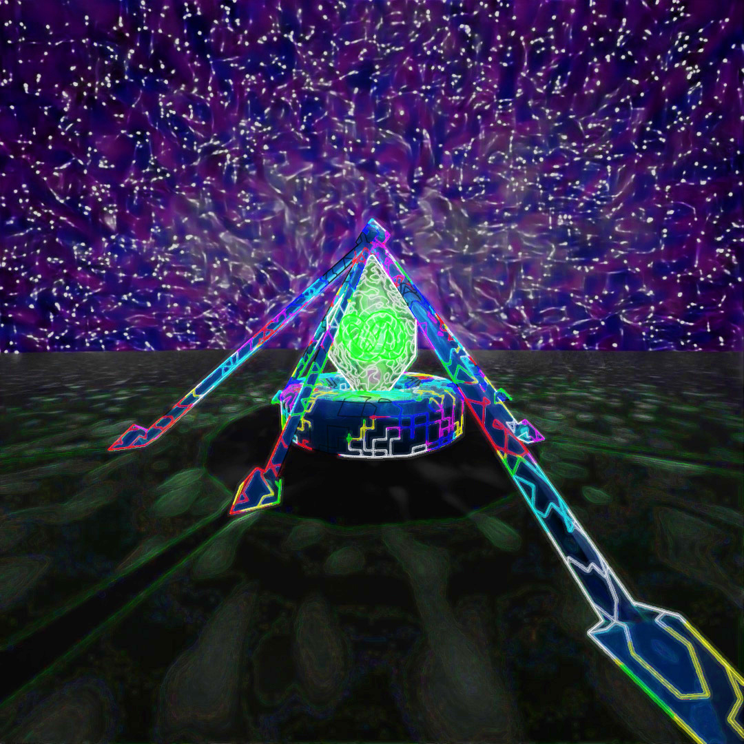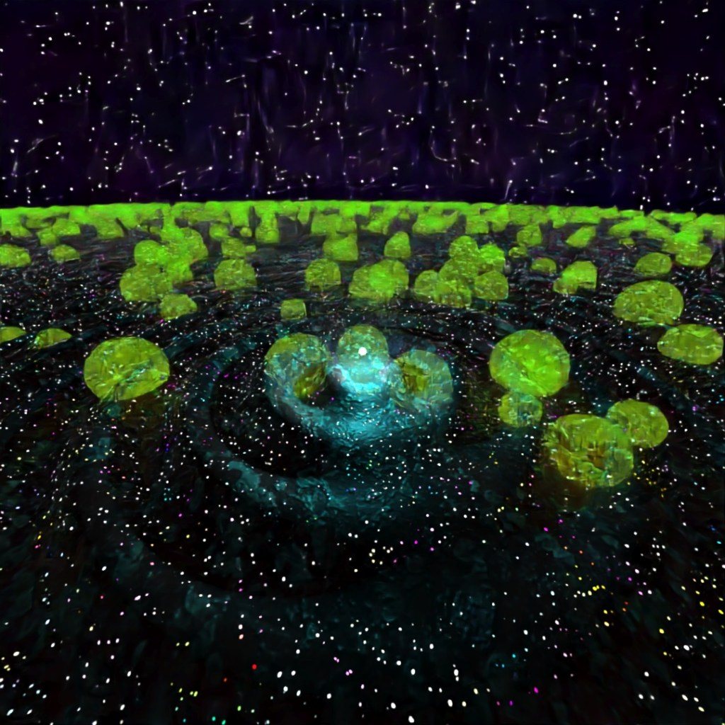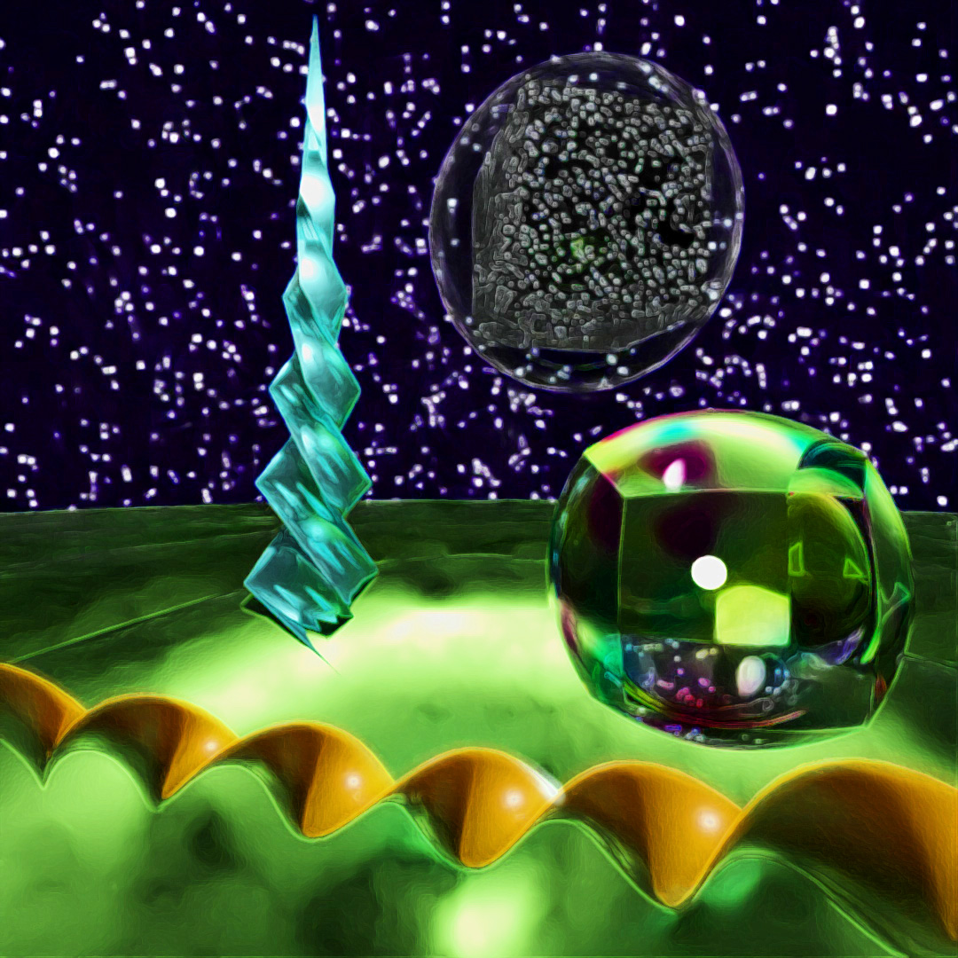 For this image I started with a large plane and applied the Ripple and Bend modifiers to it and gave it a material which used a Simplex Noise map for the emission variable. Then I made a sphere with setting Hemisphere set at .875 and used Scatter to place multiple copies all across the starting plane. I also used the Sky sphere from previous posts to make the stars. I rendered three different versions with different Depth of Field settings and layered them together in Photoshop.