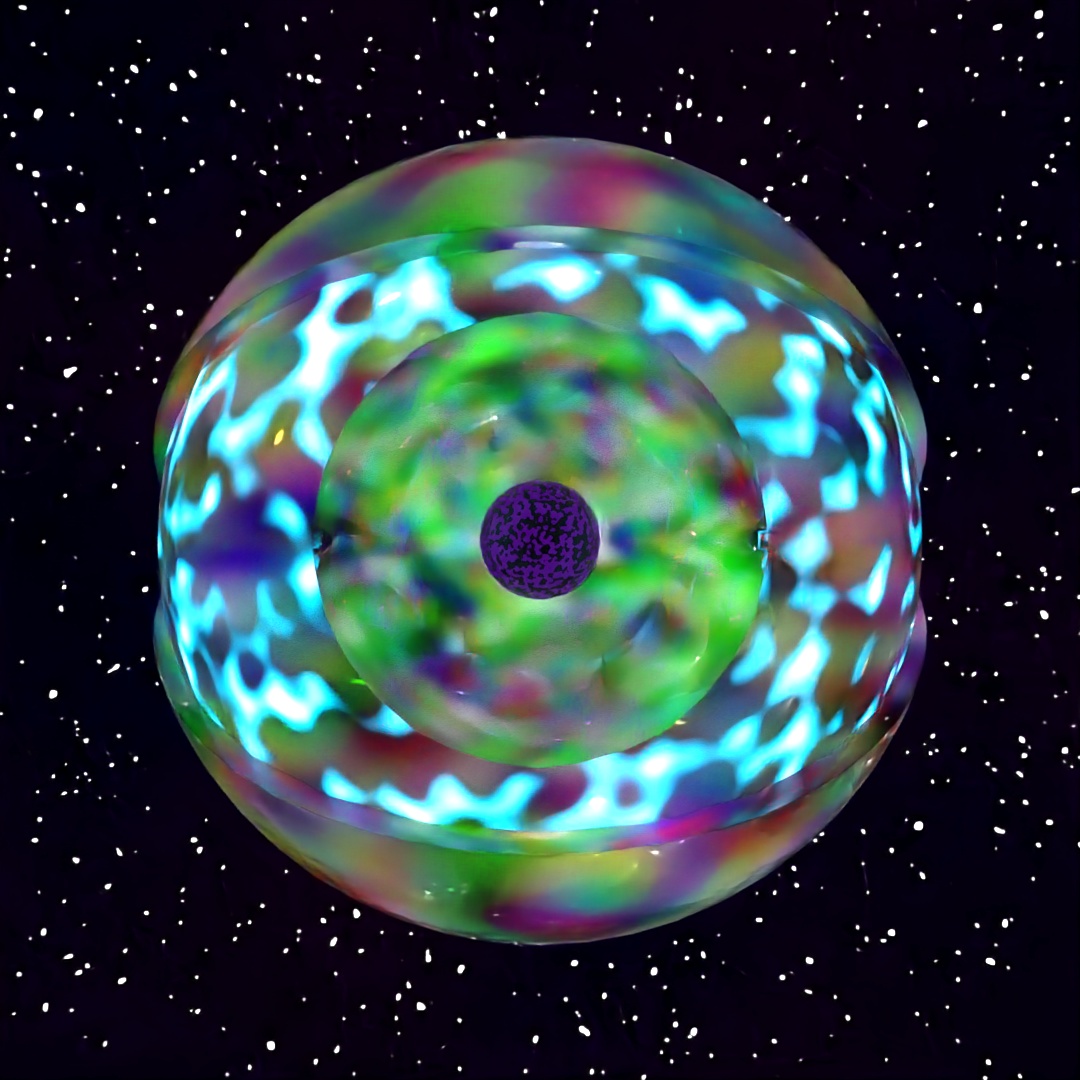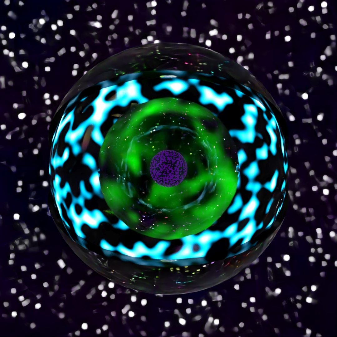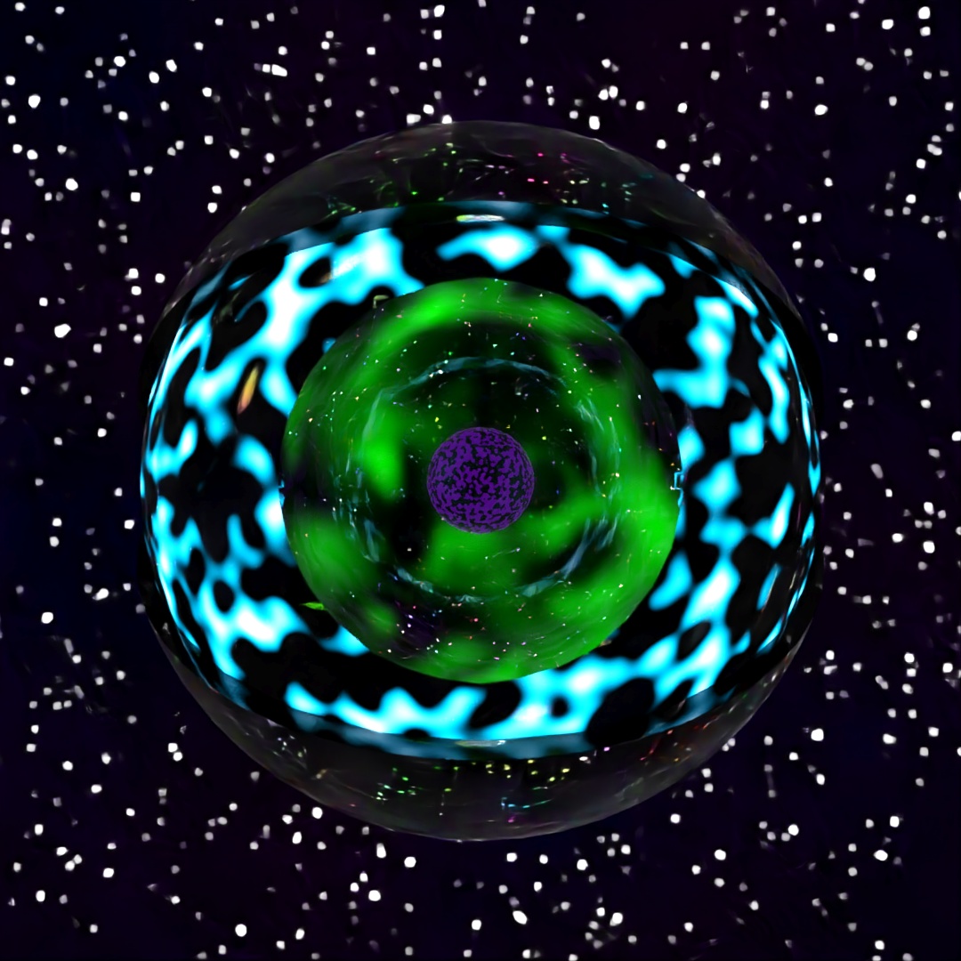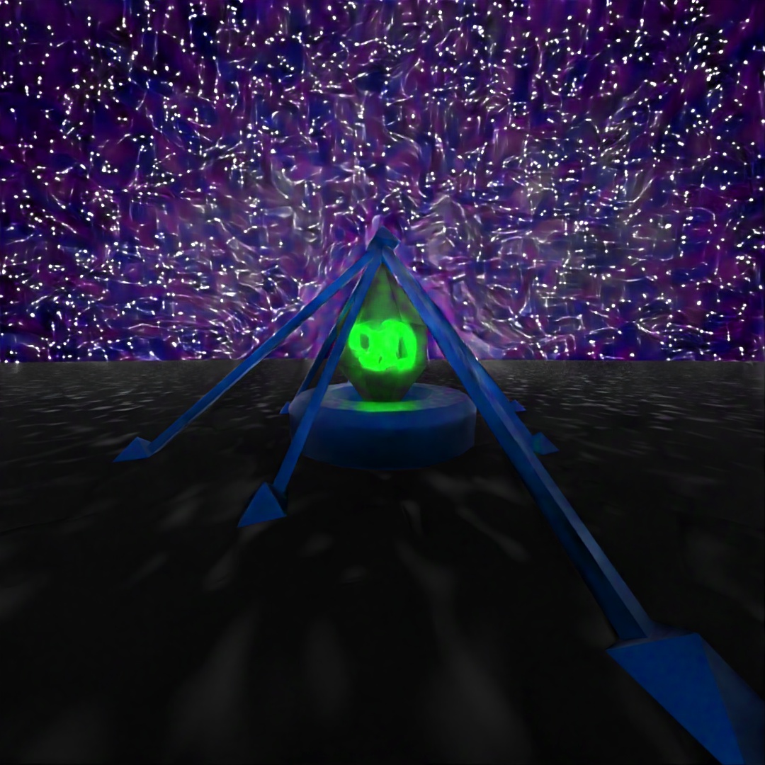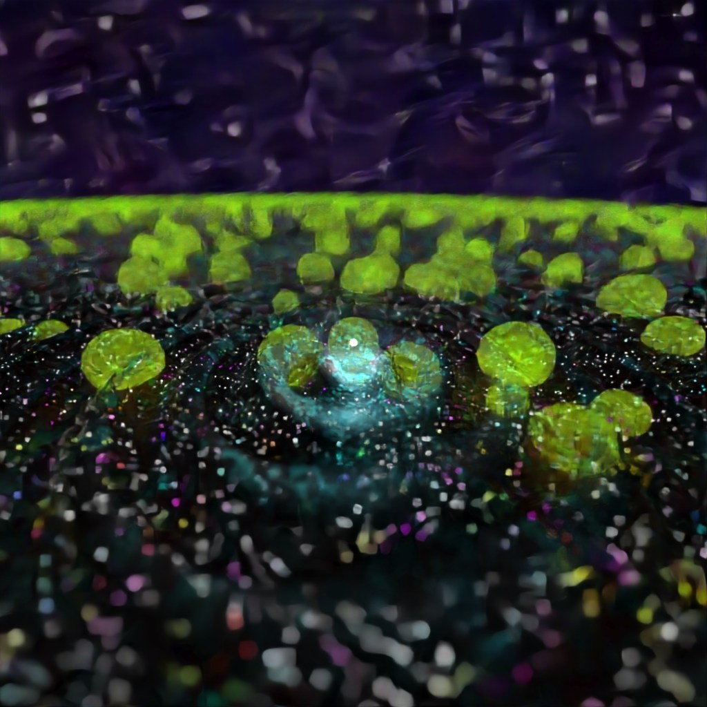 For this image I started with a large plane and applied the Ripple and Bend modifiers to it and gave it a material which used a Simplex Noise map for the emission variable. Then I made a sphere with setting Hemisphere set at .875 and used Scatter to place multiple copies all across the starting plane. I also used the Sky sphere from previous posts to make the stars. I rendered three different versions with different Depth of Field settings and layered them together in Photoshop.