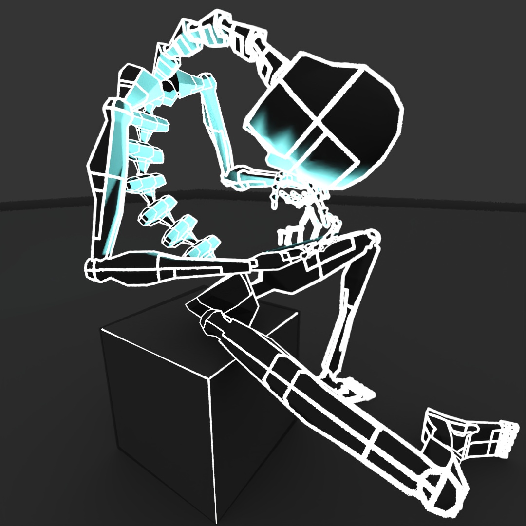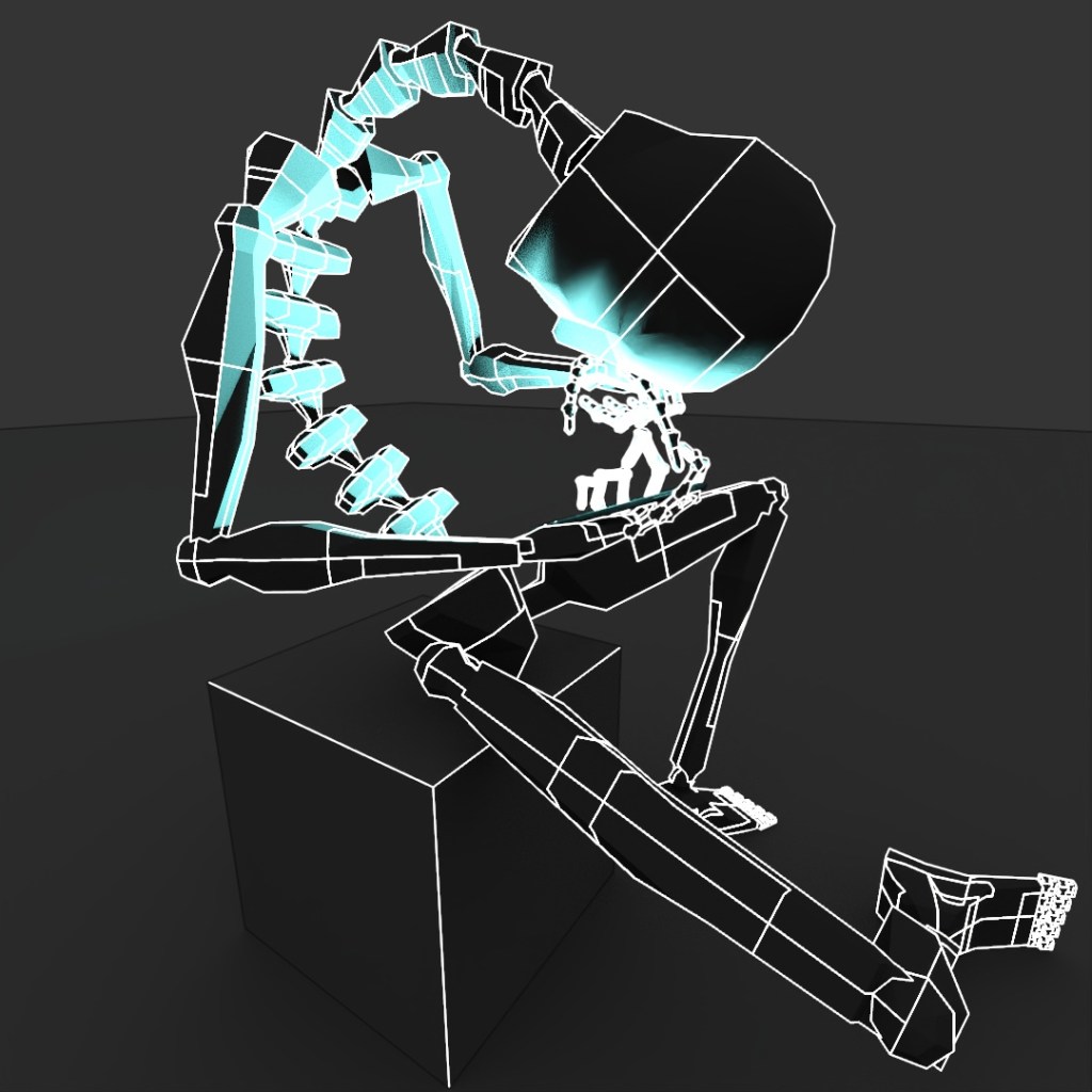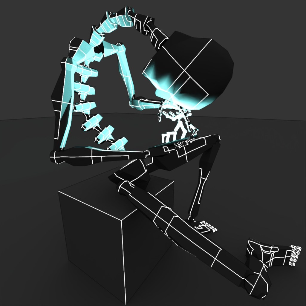 For the past few months, I’ve been dealing with some minor back pain, probably mostly caused by my own terrible posture and the fact that so much of my time recently is spent either sitting at my table working on my computer or sitting in my car, delivering food. I’ve taken steps to make it better such as (mostly) daily yoga and stretching, changing the position of my computer screens and keyboard to promote better posture and adjusted my car’s seat so that I sit up straighter and not so lopsided. All of this is to say, this post was inspired by my own terrible posture, but is probably fairly relatable to most people who spend too much time staring at their phones or computers. I used a Biped with too many spine and neck links and gave it this terrible seating position and an illuminated rectangle in its hand. I applied a few different Toon Shader materials to it for a few different renders and layered them all together in Photoshop.
