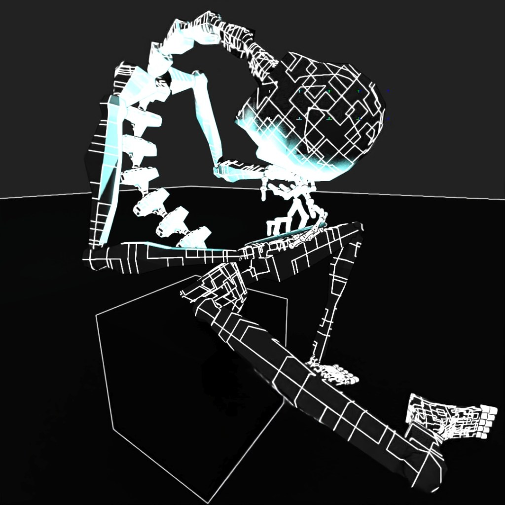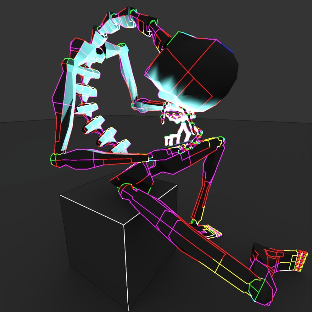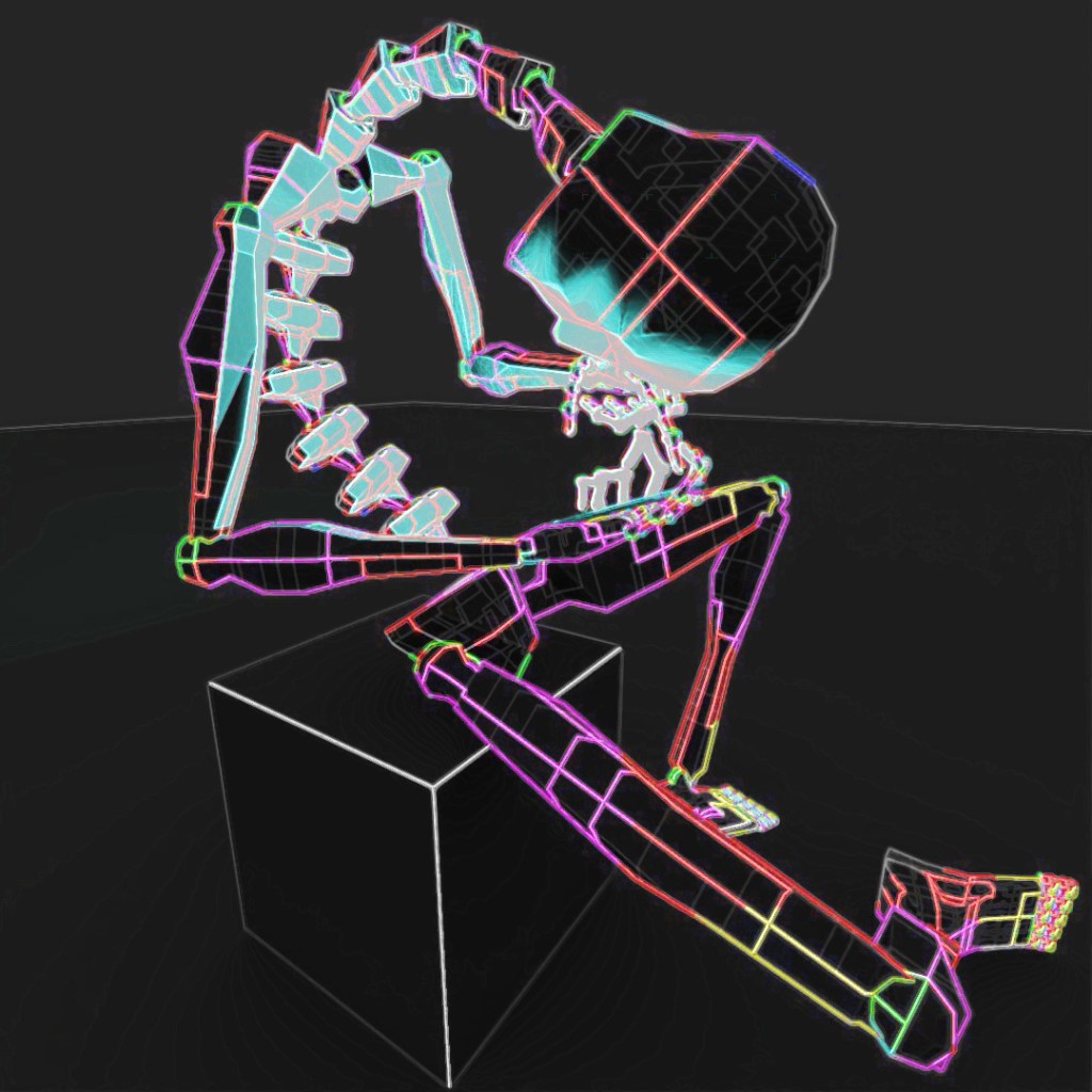 For the past few months, I’ve been dealing with some minor back pain, probably mostly caused by my own terrible posture and the fact that so much of my time recently is spent either sitting at my table working on my computer or sitting in my car, delivering food. I’ve taken steps to make it better such as (mostly) daily yoga and stretching, changing the position of my computer screens and keyboard to promote better posture and adjusted my car’s seat so that I sit up straighter and not so lopsided. All of this is to say, this post was inspired by my own terrible posture, but is probably fairly relatable to most people who spend too much time staring at their phones or computers. I used a Biped with too many spine and neck links and gave it this terrible seating position and an illuminated rectangle in its hand. I applied a few different Toon Shader materials to it for a few different renders and layered them all together in Photoshop.