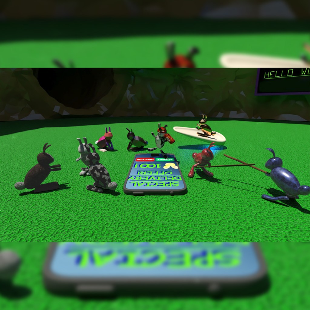 The Hoppitys are a class of characters from TPS2 whose warren have been newly incorporated into the Faelville society. They come in varieties ranging from metalic robotic to fuzzy and cute to ninja fighting Hoppitys. The hero of our story (Hoppity Hip) rides a giant phone with a constant eye on his gig-working app.