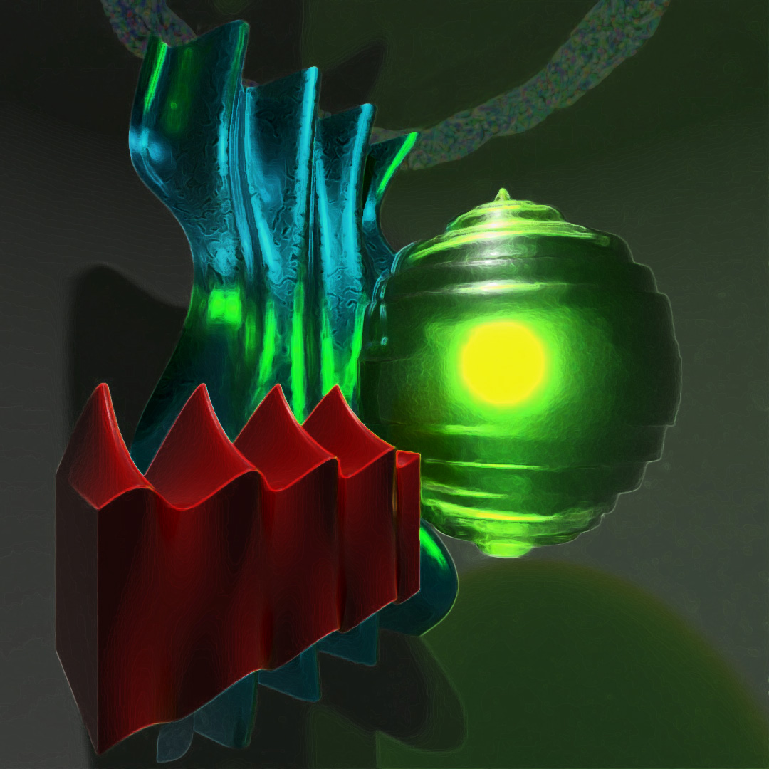 For this image I applied a Ripple modifier to a sphere (hence the name) and made the material for this object a green frosted glass. I put a light inside the RippleSphere and also at the top of the setting. The plane has a Wave modifier and a blue Stained Copper material set to it. The box also has a Wave modifier and is a red glossy plastic material. I rendered a few different versions and layered them together in Photoshop.