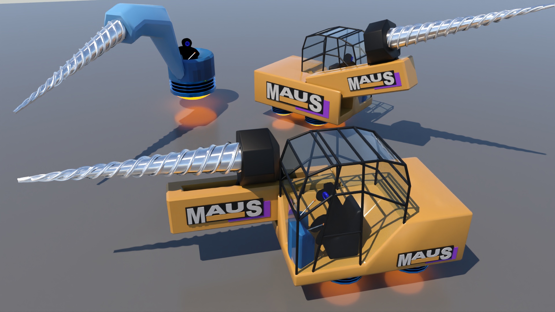 The majority of the plot in my TPS2 story revolves around the fact that the complex has run out of NRG. The Tiny Dolls are responsible for drilling into the NRG crystals and emptying the NRG into the silos, so that it can be pumped throughout the complex, powering the machines and force fields and hover-bubbles. This was my first couple tries at modeling the driller machines. Because I used Toon Shader to make the Tiny Dolls, I have to render one version with them as just black bodies and a second version with just the Alpha channel on (and using PNG instead of JPG) and them put them together in Photoshop.