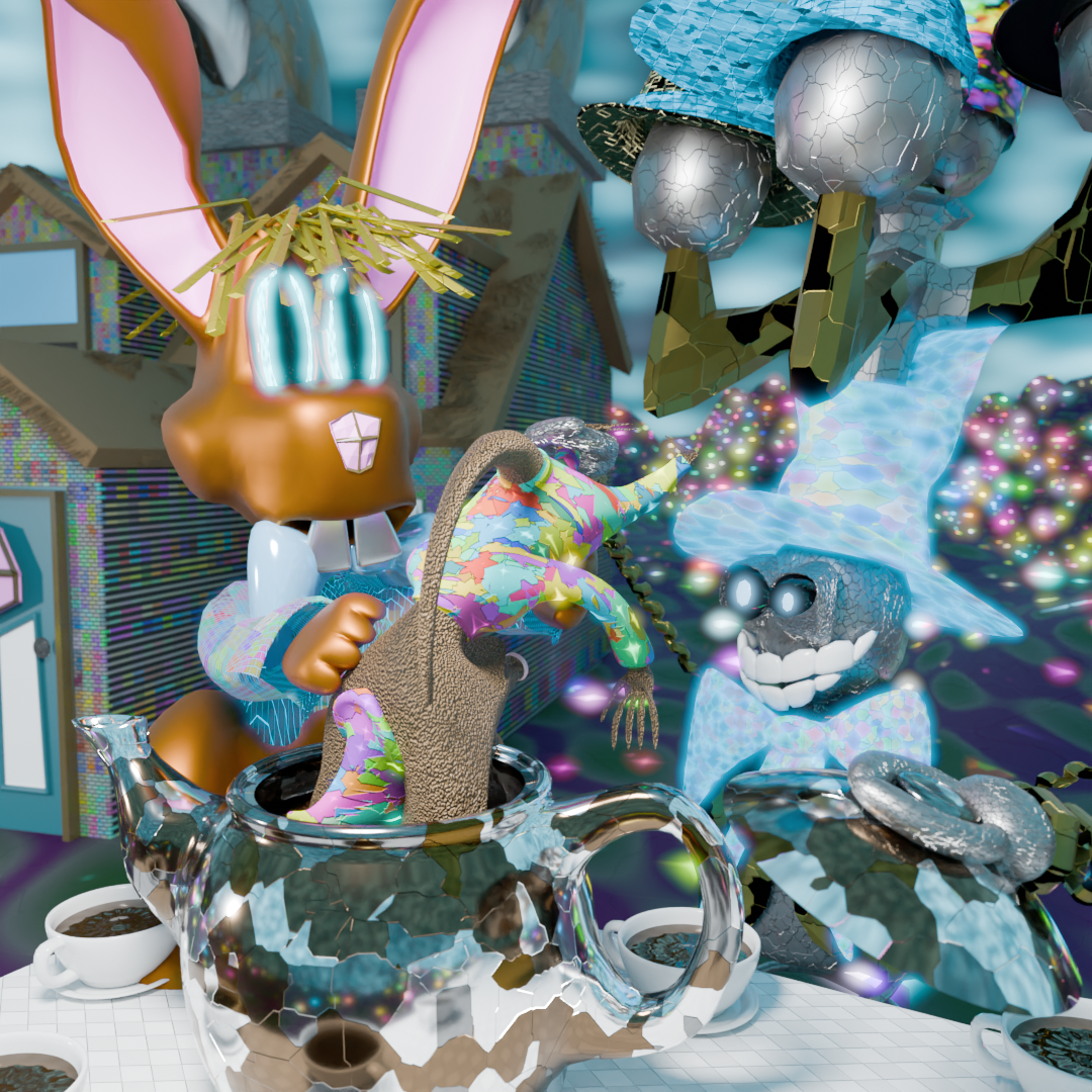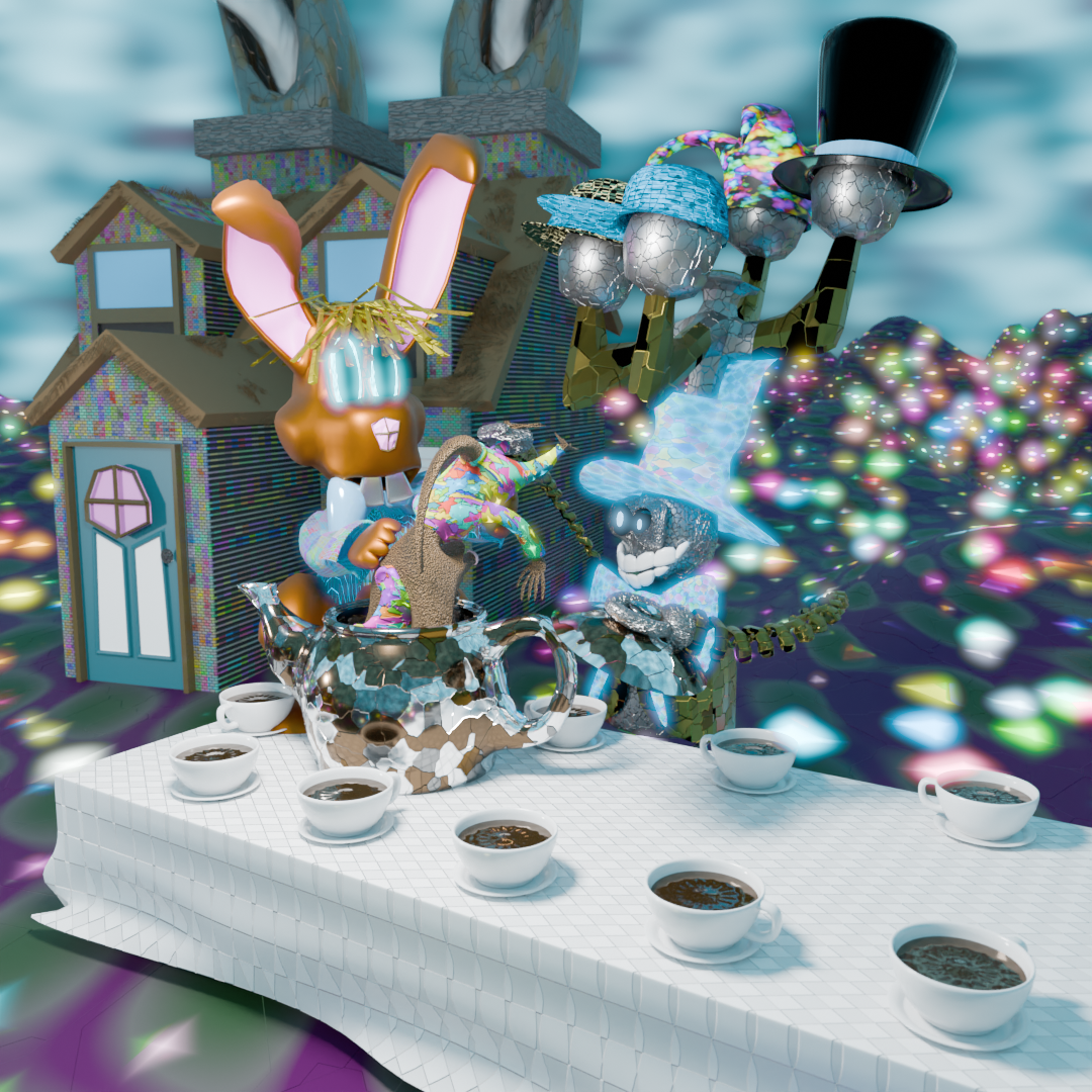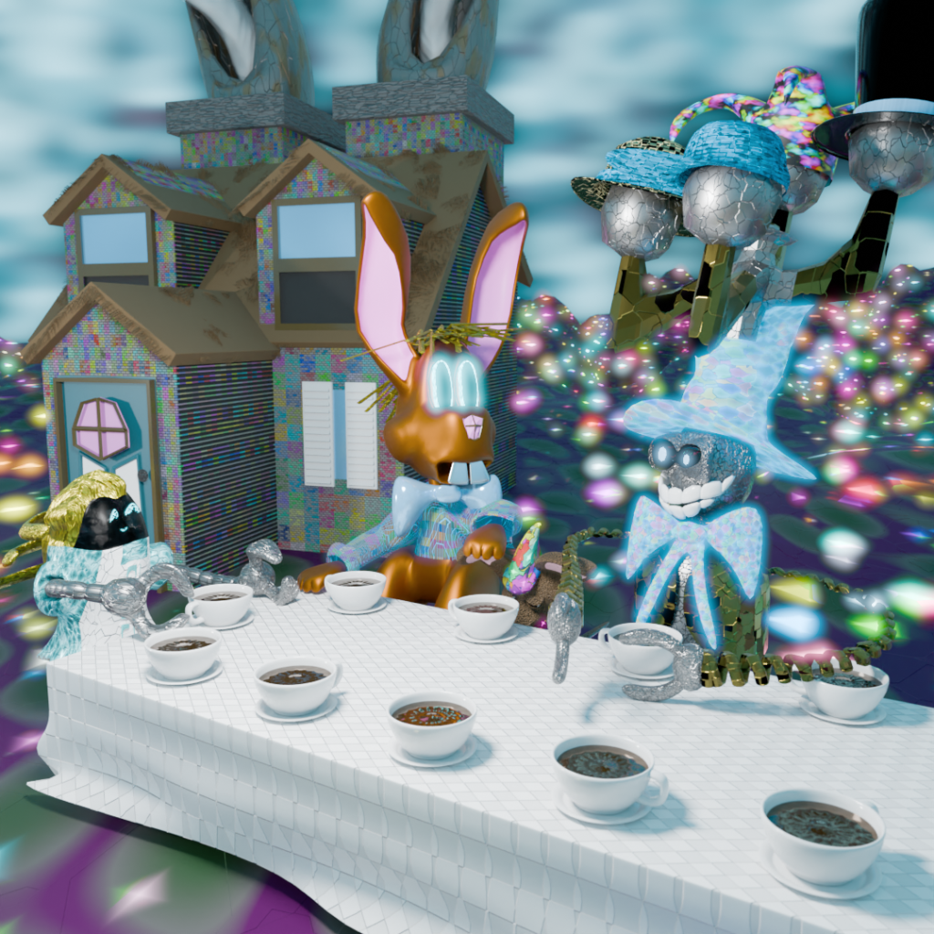 “…the March Hare and the Hatter were having tea at it: a Dormouse was sitting between them, fast asleep, and the other two were using it as a cushion, resting their elbows on it, and talking over its head.”