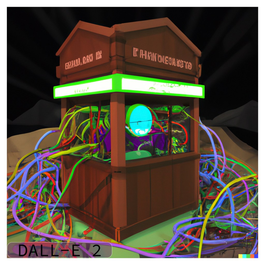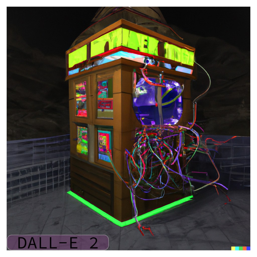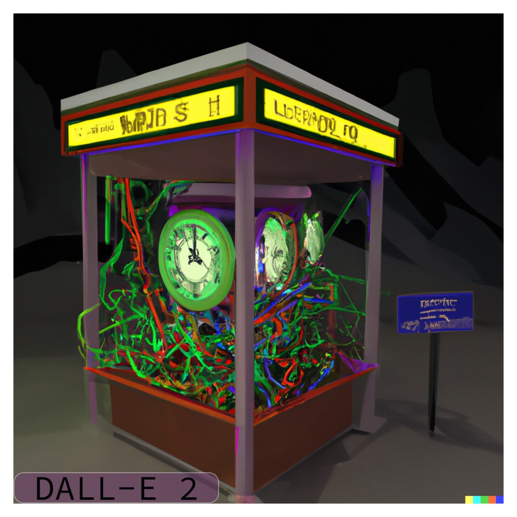I used the “variations” function of DALL-E 2 to create two rounds (8 images) of variations. Many of the variations definitely try to produce lettering and signs but none of them produced any actual words. One of the images did a really good job of detecting the “time” theme and put a clock in the middle of the structure. I also find it interesting that some of the images produce a chaotic mess of wires strewn across the screen, while some keep to the original idea of the cords all inside the box.