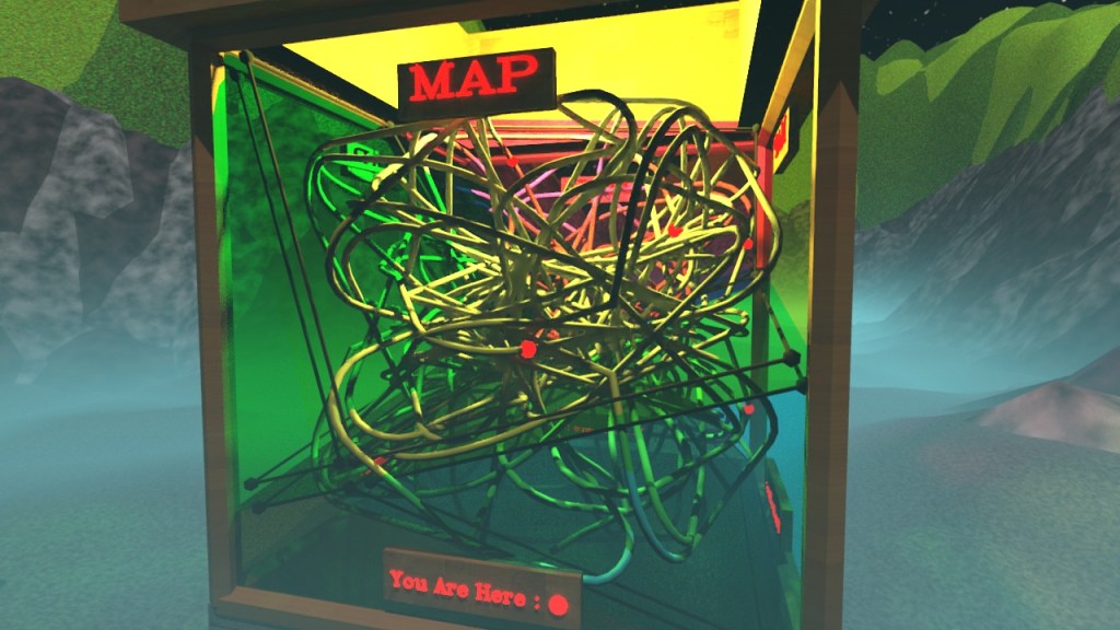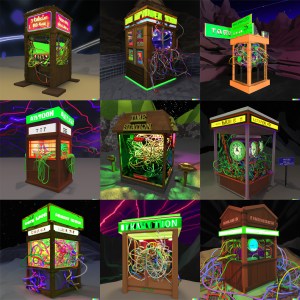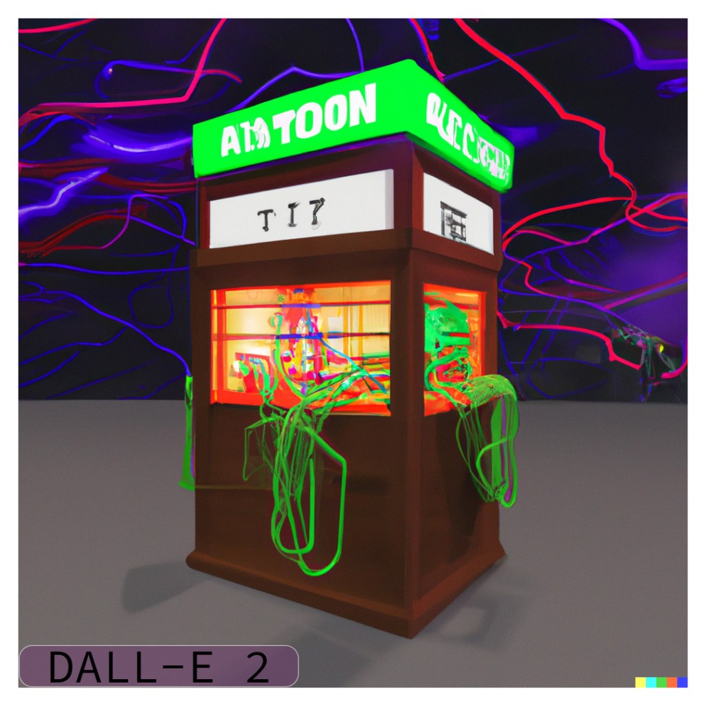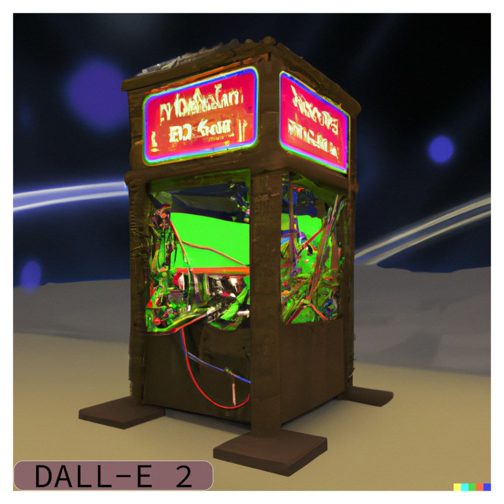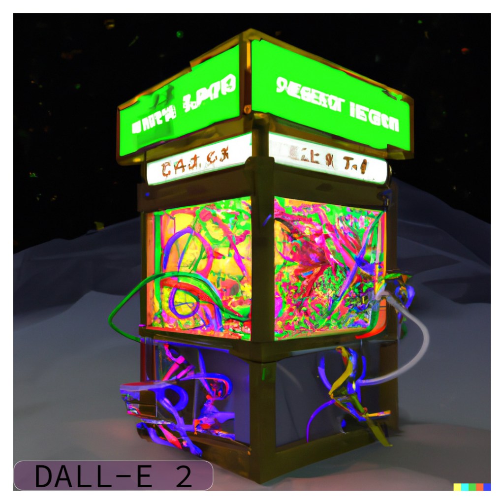 I used the “variations” function of DALL-E 2 to create two rounds (8 images) of variations. Many of the variations definitely try to produce lettering and signs but none of them produced any actual words. One of the images did a really good job of detecting the “time” theme and put a clock in the middle of the structure. I also find it interesting that some of the images produce a chaotic mess of wires strewn across the screen, while some keep to the original idea of the cords all inside the box.