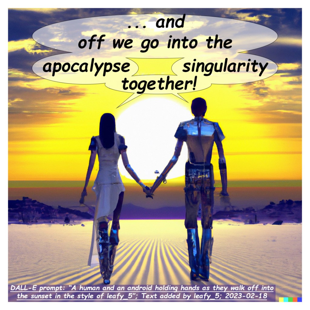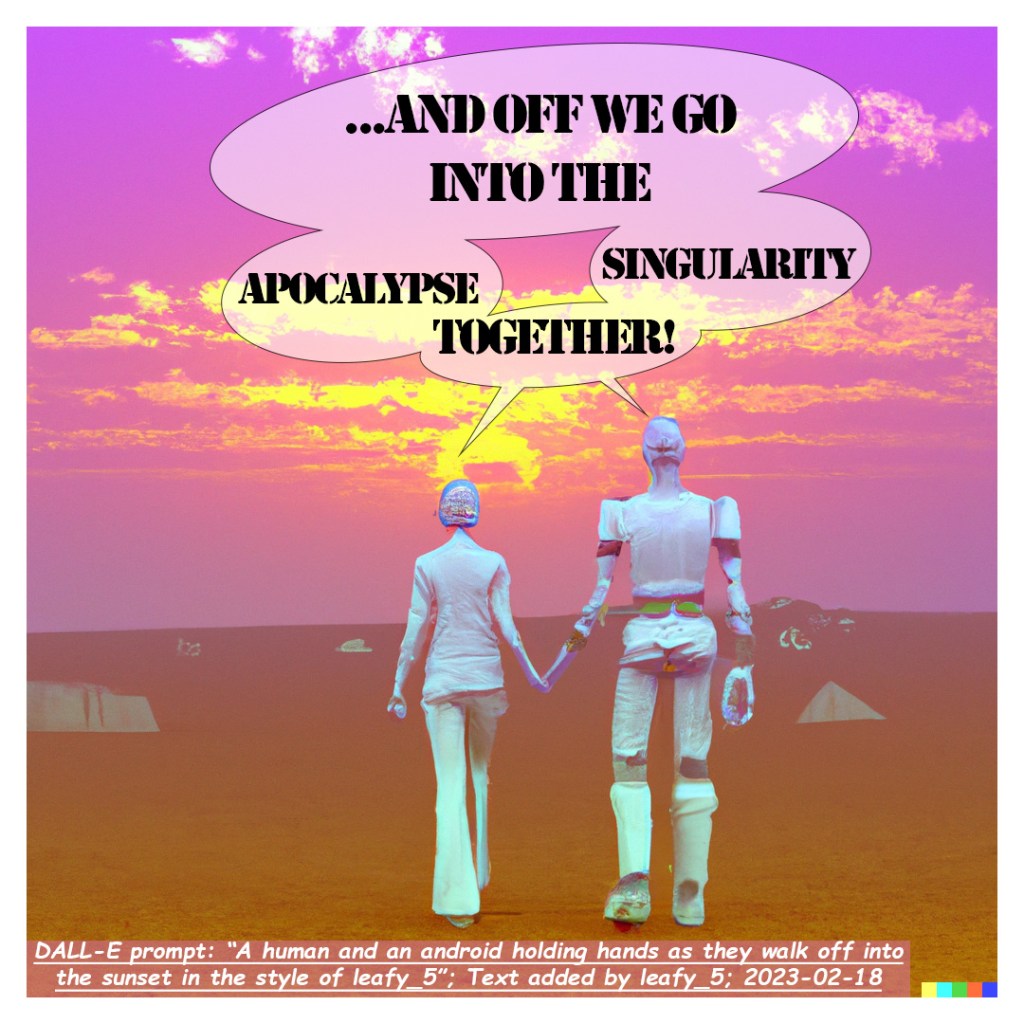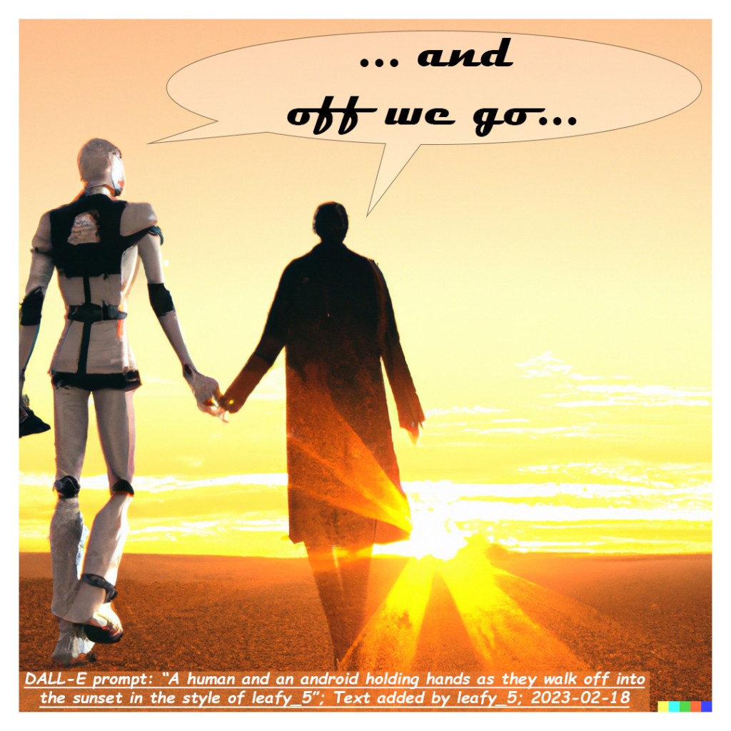 A human and an android holding hands as they walk off into the sunset in the style of leafy_5