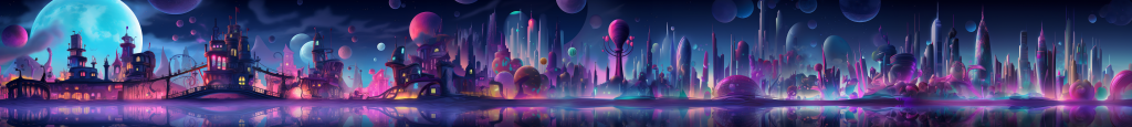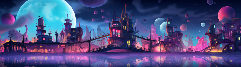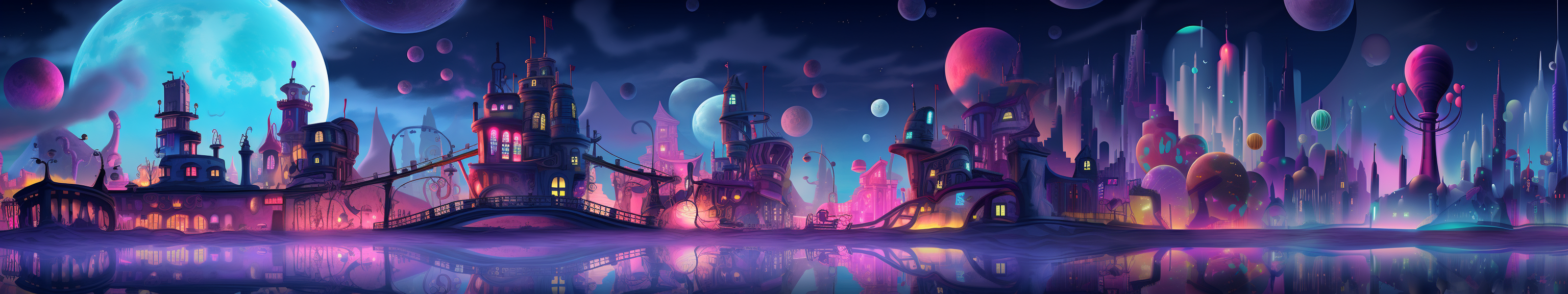 Start: 3D low-poly, side-scroller video game background, psychedelic city, luminescent, cartoon –no people –ar 32:9
