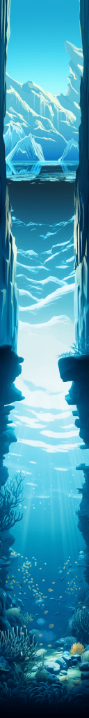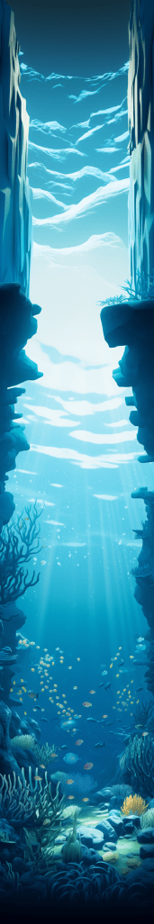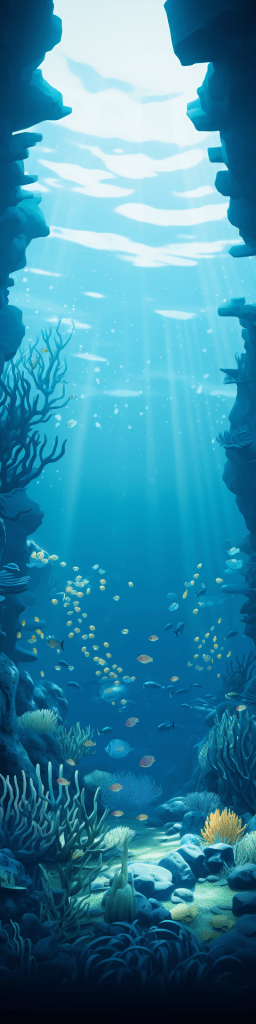 3D low-poly, video game background, water surface, coral reef, luminescent –ar 1:4