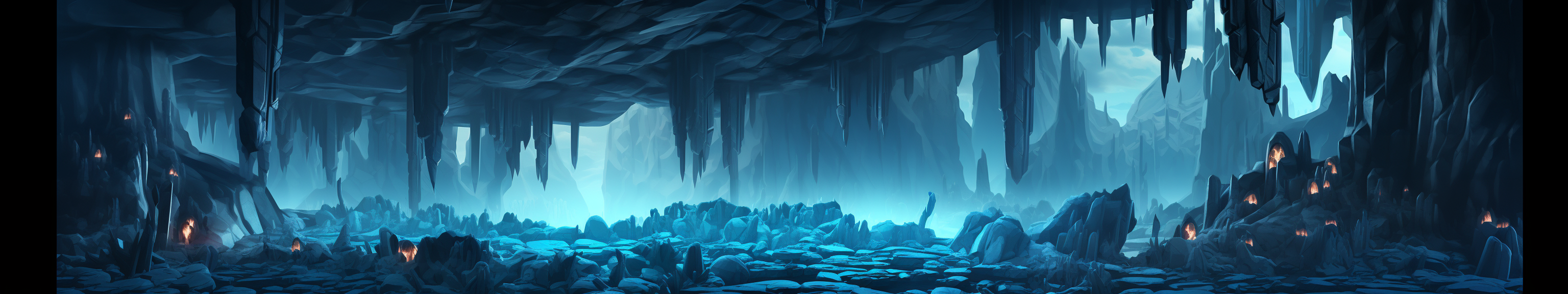 Start: 3D low-poly, side-scroller video game background, underground sapphire mine cavern, luminescent, lanterns, wooden_beams, stalactites –ar 8:1