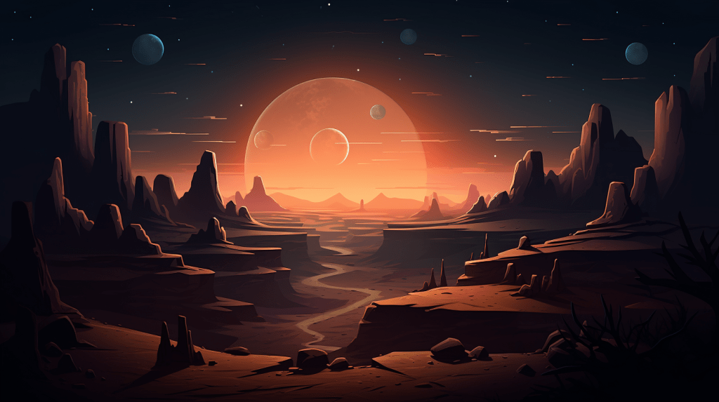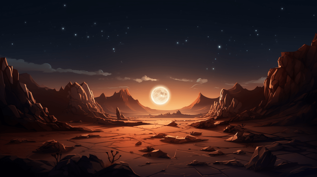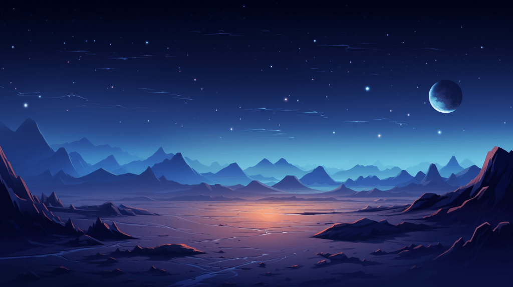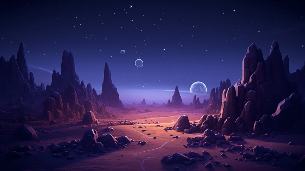 Same prompt for all 4 images: 3D low-poly, side-scroller video game background, nighttime desert, luminescent –ar 16:9