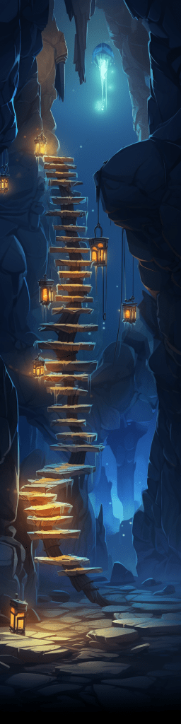 3D low-poly, side-scroller video game background, underground sapphire mine cavern, luminescent, lanterns, wooden_beams, stalactites –ar 1:4