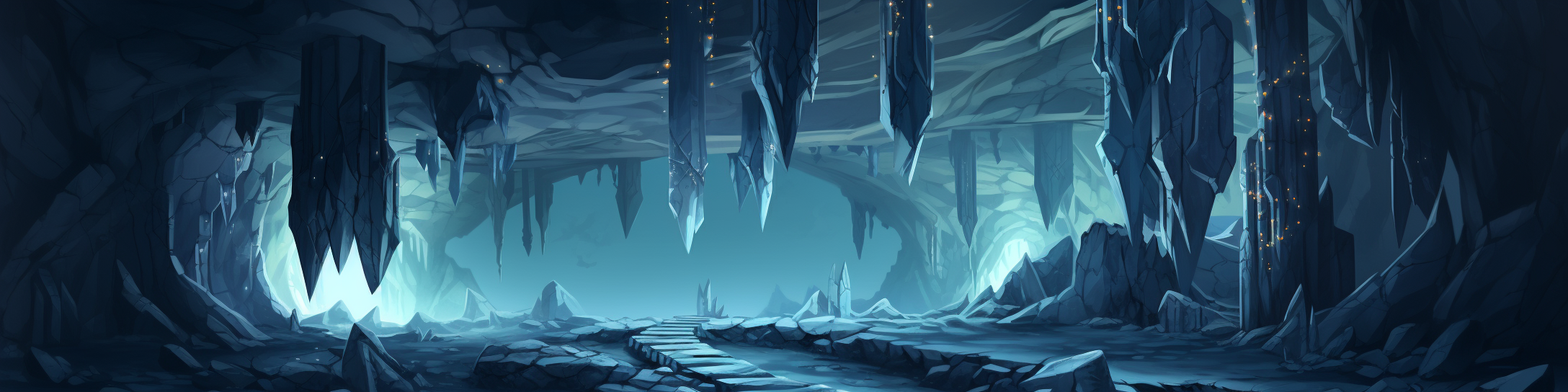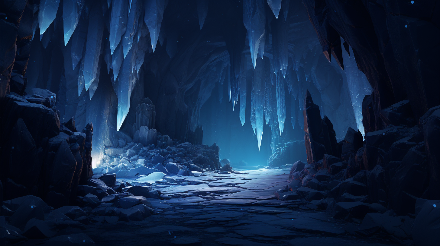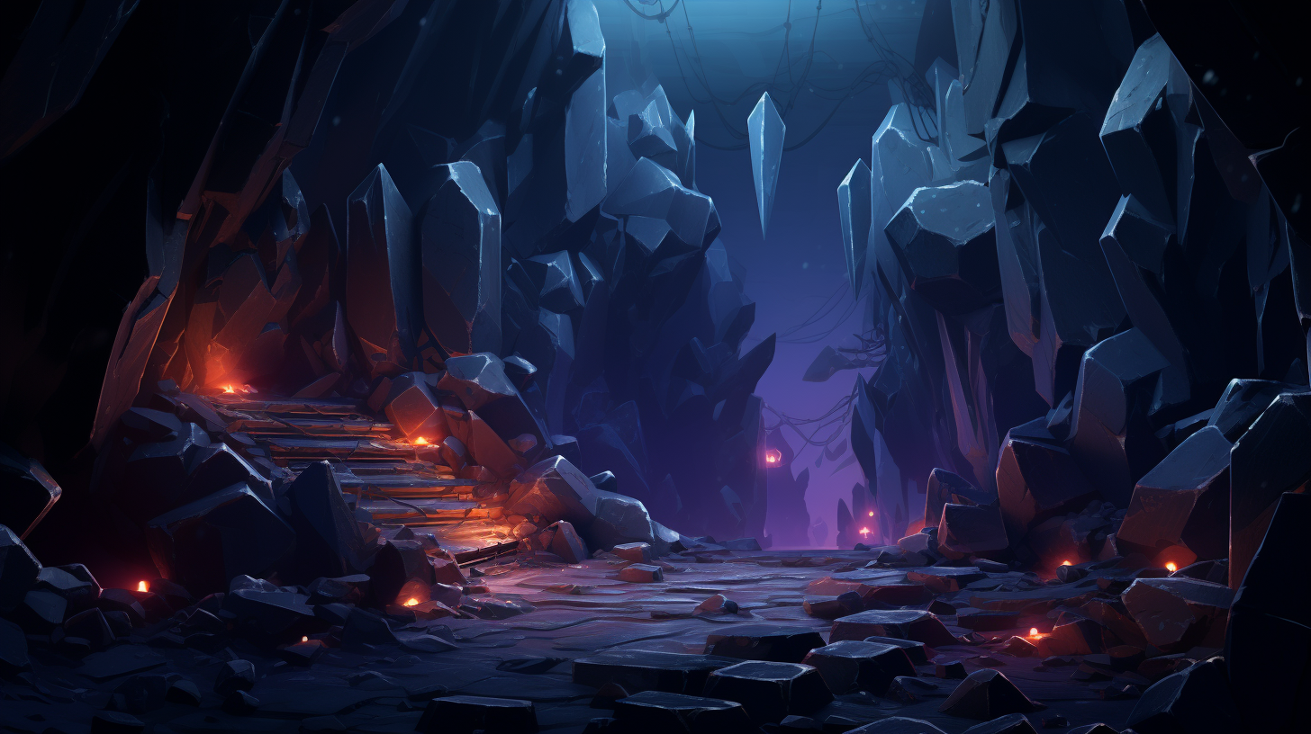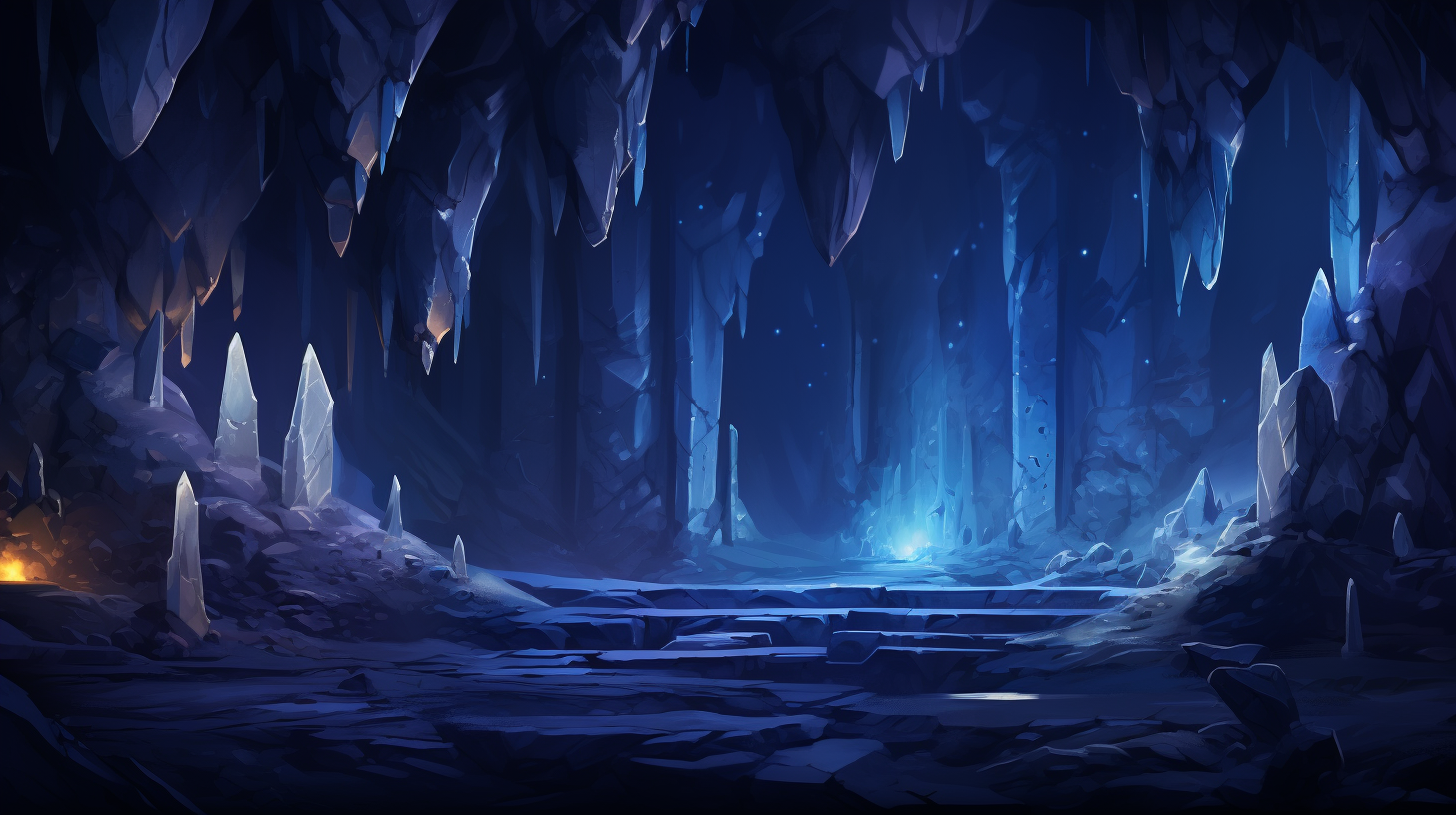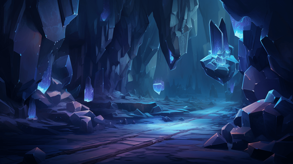 3D low-poly, side-scroller video game background, underground sapphire mine, luminescent, stalactites –ar 16:9