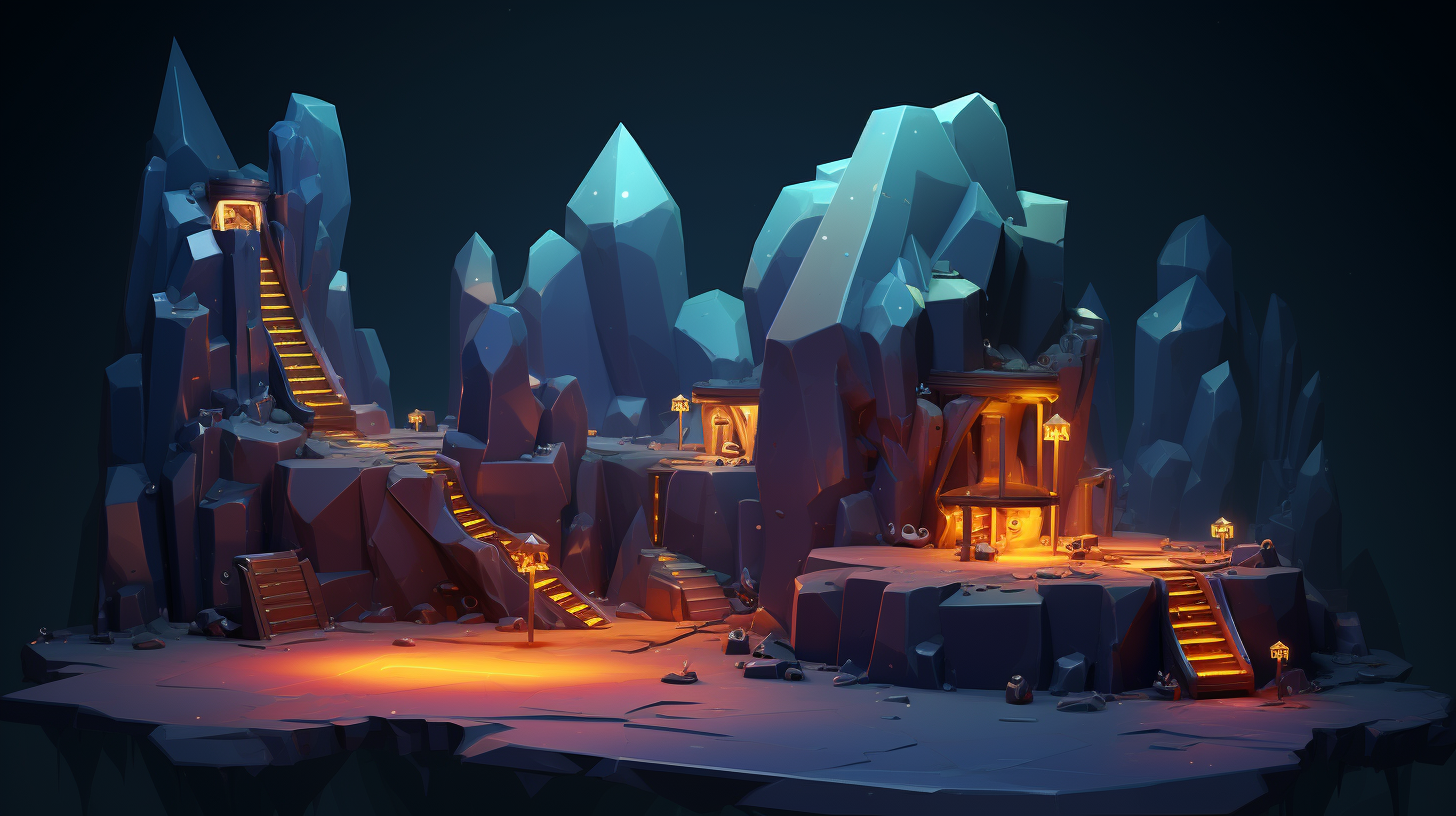 3D low-poly, side-scroller video game background, sapphire mine, luminescent –ar 16:9